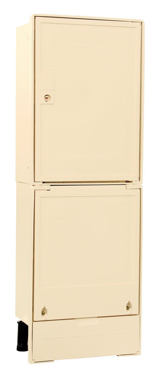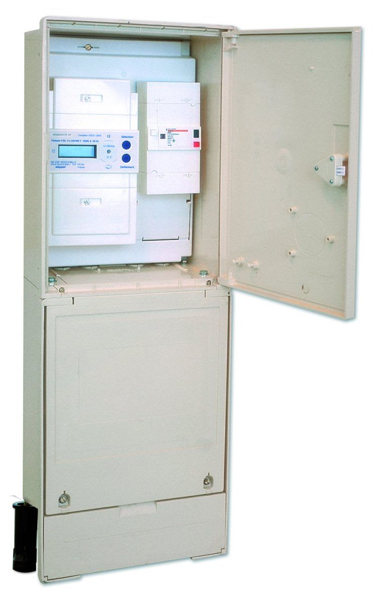 Coffrets S20 sur socles équipéCoffret sur socle équipé panneau amovible pour compteur et disjoncteur triphasé + neutreSerrure RectangleSigle EclairColoris Ivoire