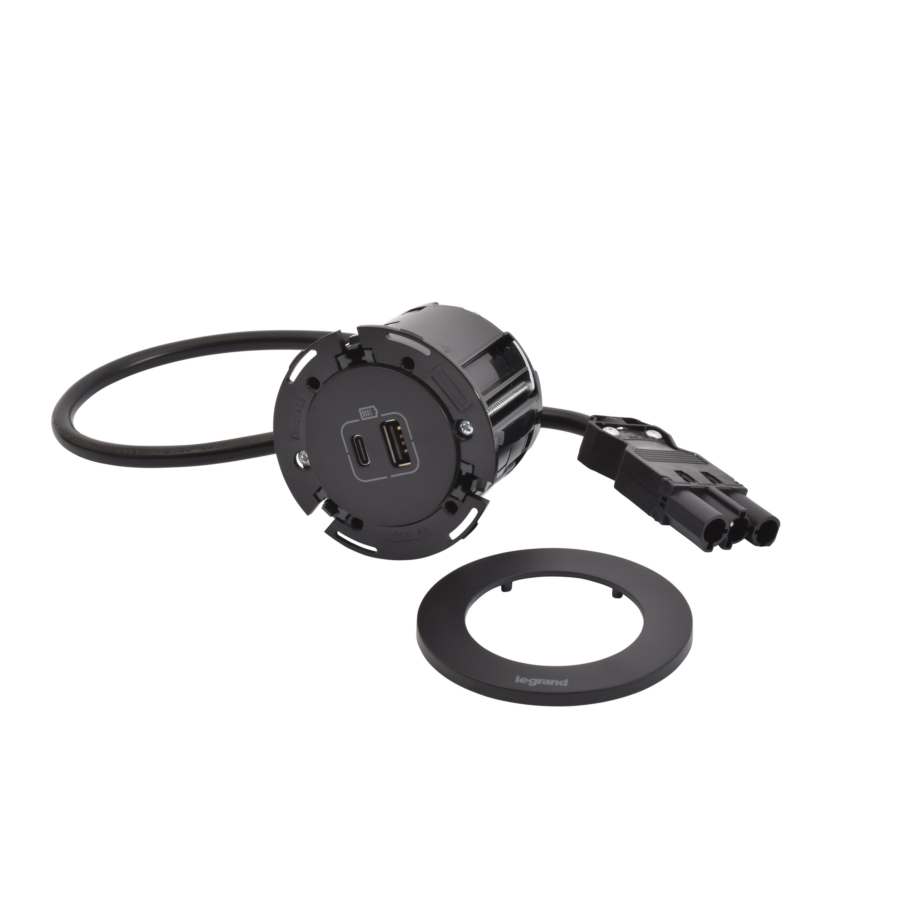 Disq 60 Incara avec chargeur USB TypeA+TypeC 15W livré avec cordon de longueur 0,5m équipé d'un connecteur Wieland - finition noir Ø60mm à fixer sur tout type de support, d'épaisseur 1 mm minimum à l’horizontale comme à la verticale