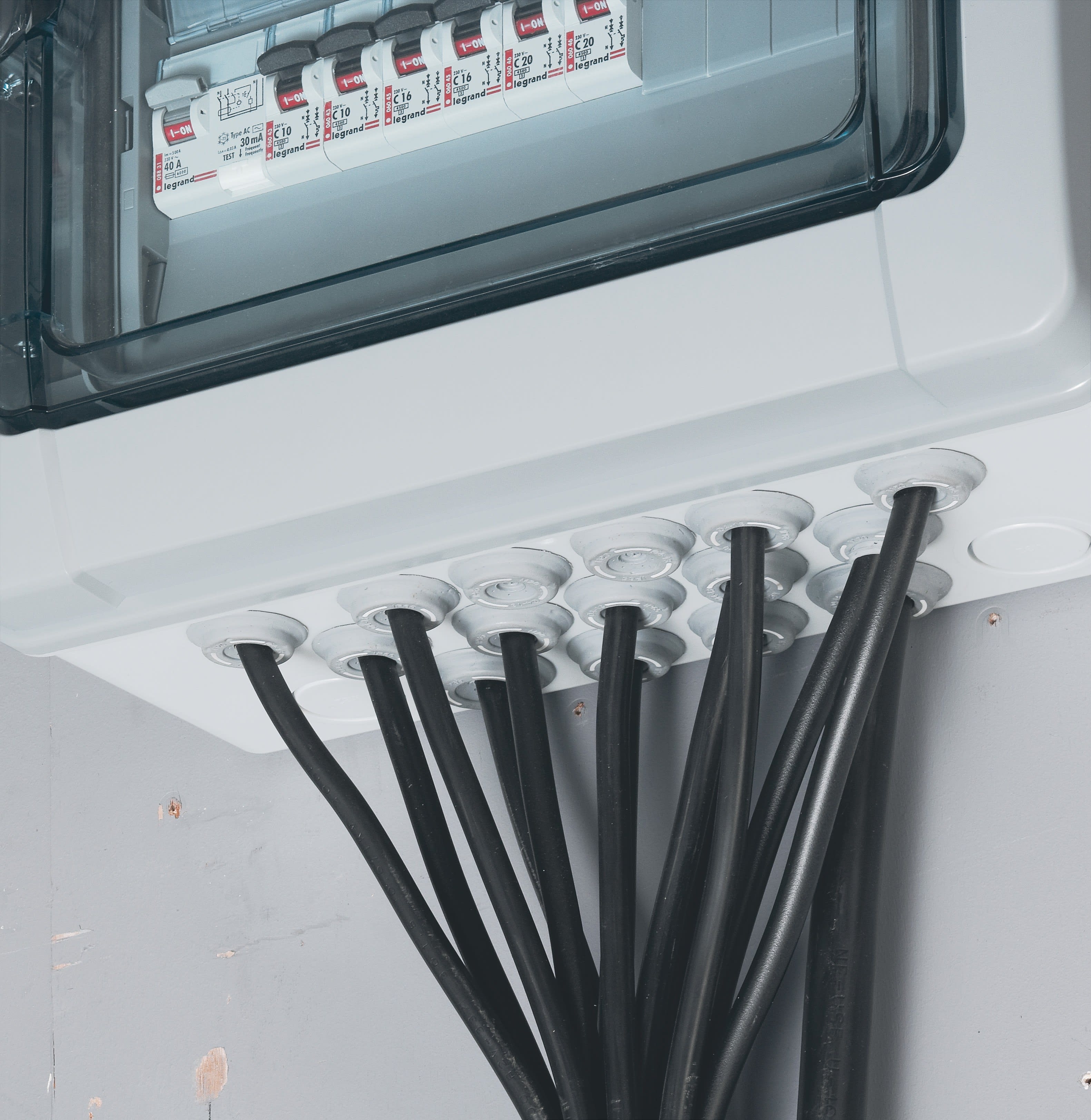 L'étanchéité et la robustesse des coffrets Plexo³ pour tous les chantiers. Grâce à leur IP 65, à leur traitement UV et au double point de fermeture, l'étanchéité est garantie pour une installation dans des lieux humides en intérieur comme extérieur. Grâce à leur IK 09 leur résistance aux chocs est assurée et la poignée encastrée est protégée. Il est également possible de sécuriser le coffret par plombage entre le capot et le plastron et/ou le capot et le fond du coffret ainsi que par verrouillage de la porte par une serrure à clé. La réversibilité totale du coffret permet de pouvoir câbler par en haut ou par en bas sans distinction. La rapidité et facilité de mise en œuvre par des plastrons et rails amovibles, par le châssis extractible pour un câblage hors coffret, par le bornier extractible et repositionnable facilement, en partie haute et basse du coffret, ainsi par la possibilité d'ajouter qu'une gaine multifonctions font de ces coffrets un incourtounable pour les installateurs.