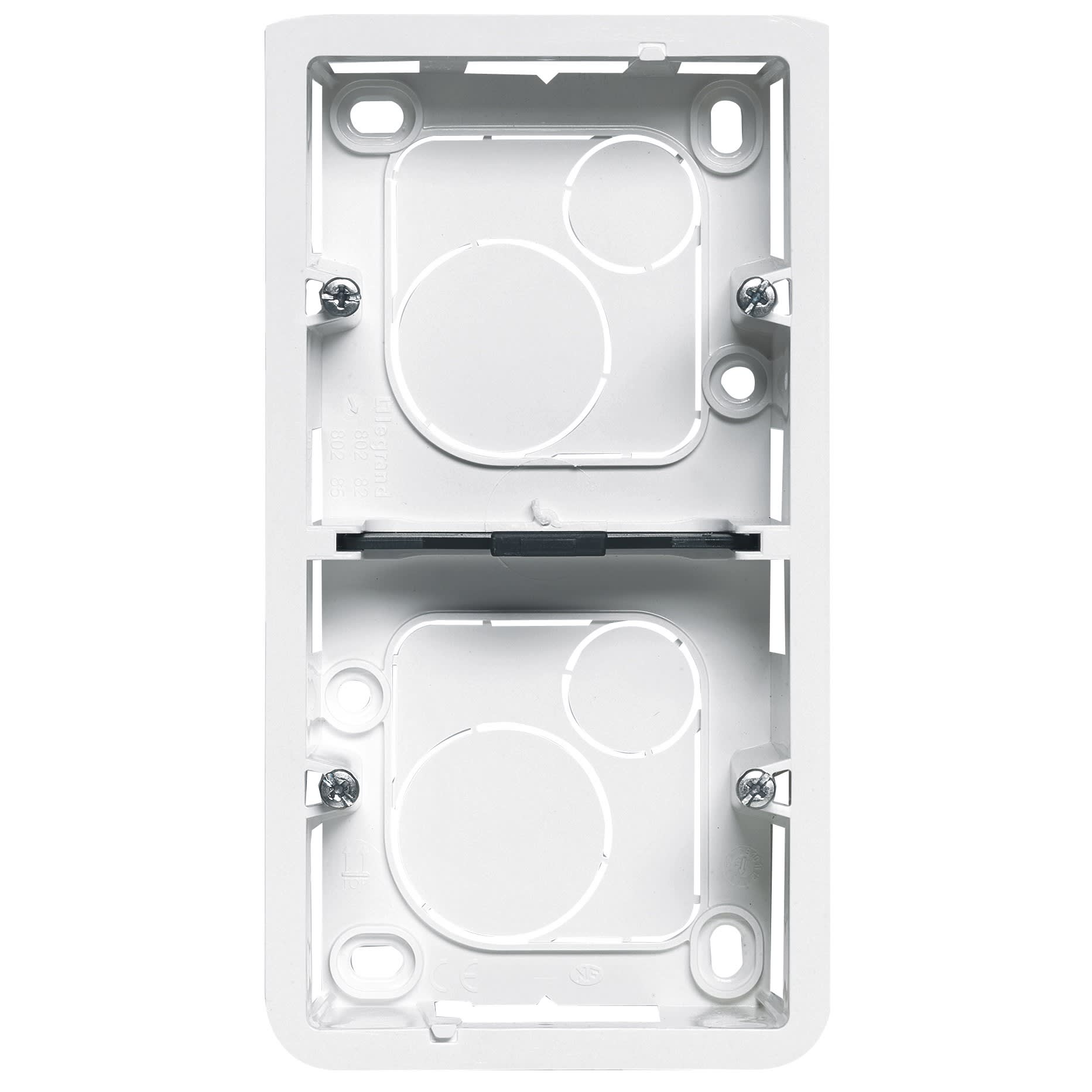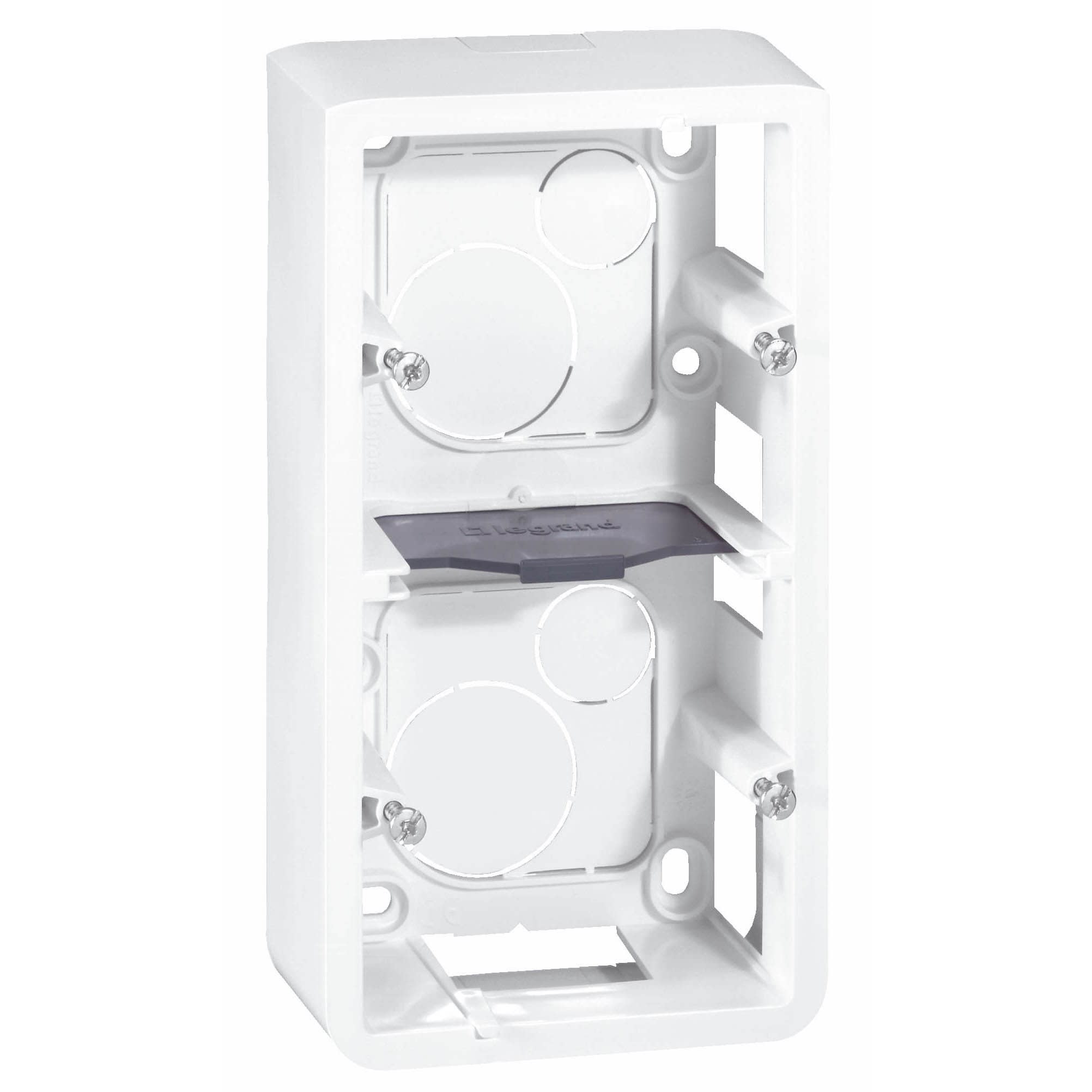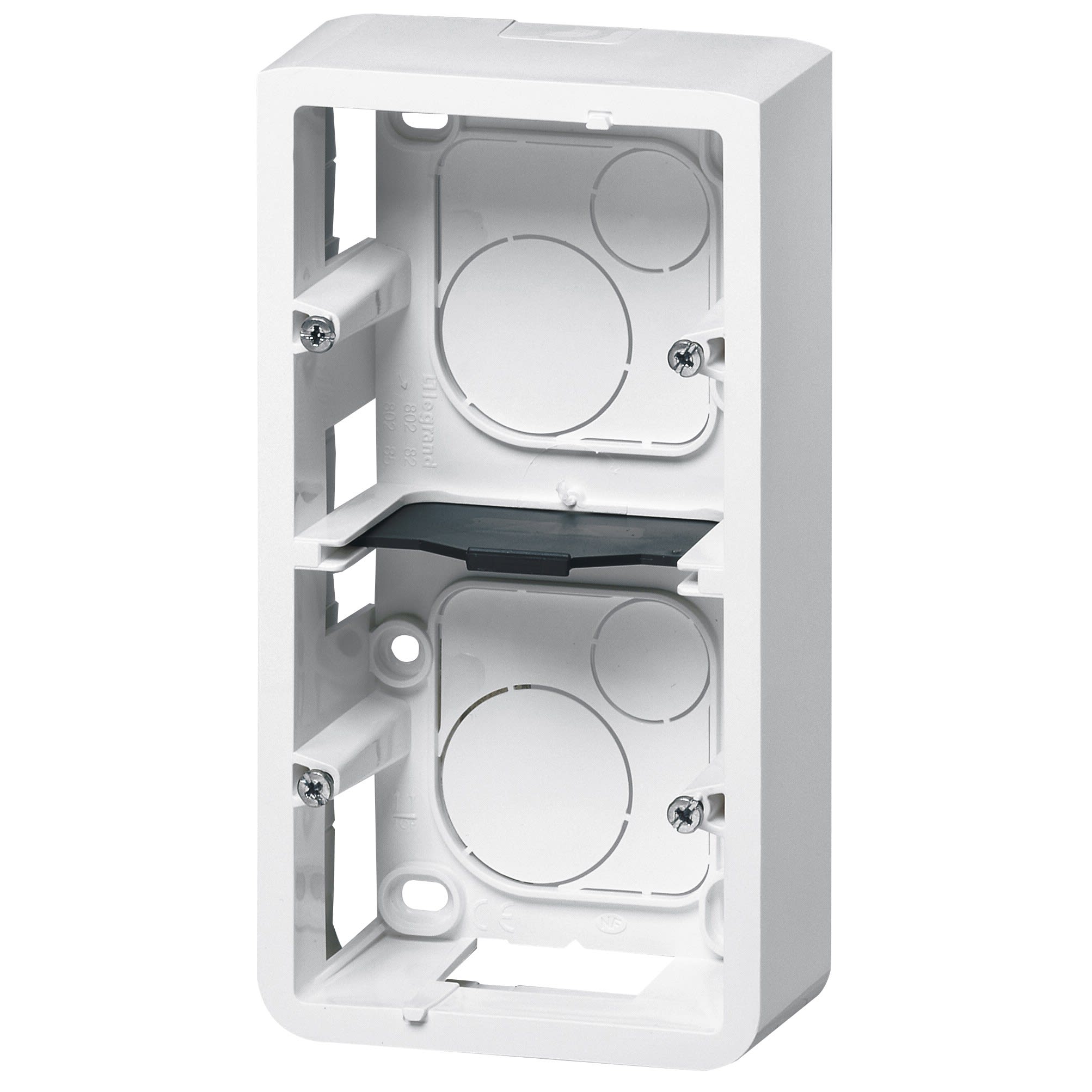 Cadre saillie Mosaic 5 modules ou 2x2 modules en montage vertical - A utiliser avec le support Batibox référence 080252 Profondeur 40mm Equipé d'une entrée amovible pour moulure 20x12,5mm - Installation en saillie avec conduits apparents (moulure/goulotte) ou avec conduits encastrés Livré avec vis Blanc RAL9003 finition brillante
