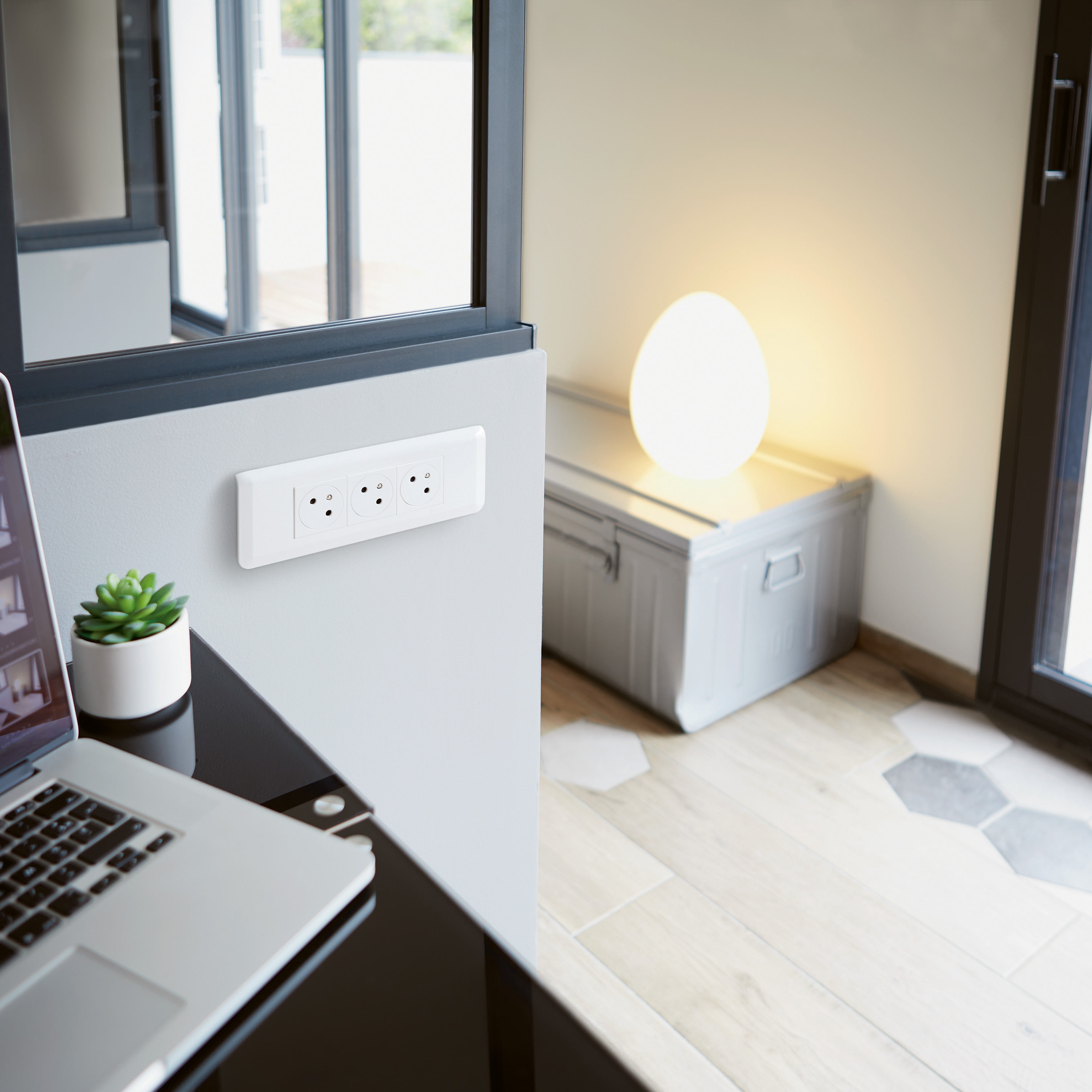 Prise de courant 2P+T Surface Mosaic Link 16A 230V à connexion latérale par bornes automatiques bi-stables - À équiper d'un support et d'une plaque Mosaic 2 modules - Blanc RAL9003 finition brillante L'inclinaison à 45° des puits de prise permet de gagner de la place lors du branchement de plusieurs appareils electriques ou electroniques volumineux Résistance aux chocs renforcée : indice IK07 Connexion par bornes automatiques à levier permettant la connexion rapide sans outil