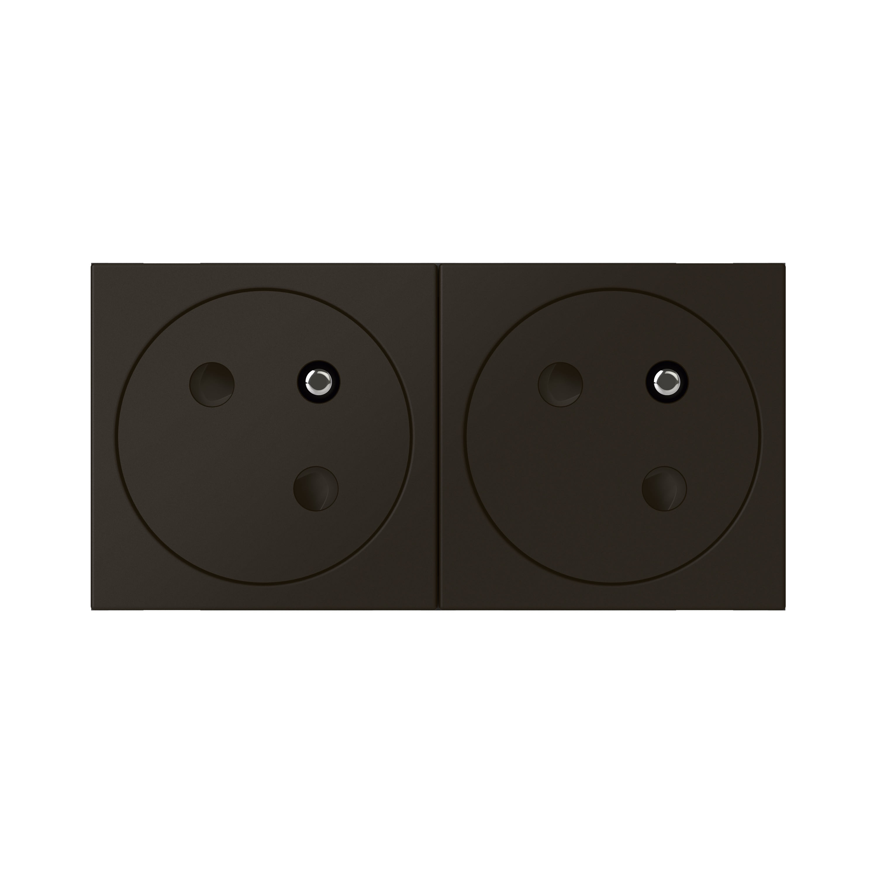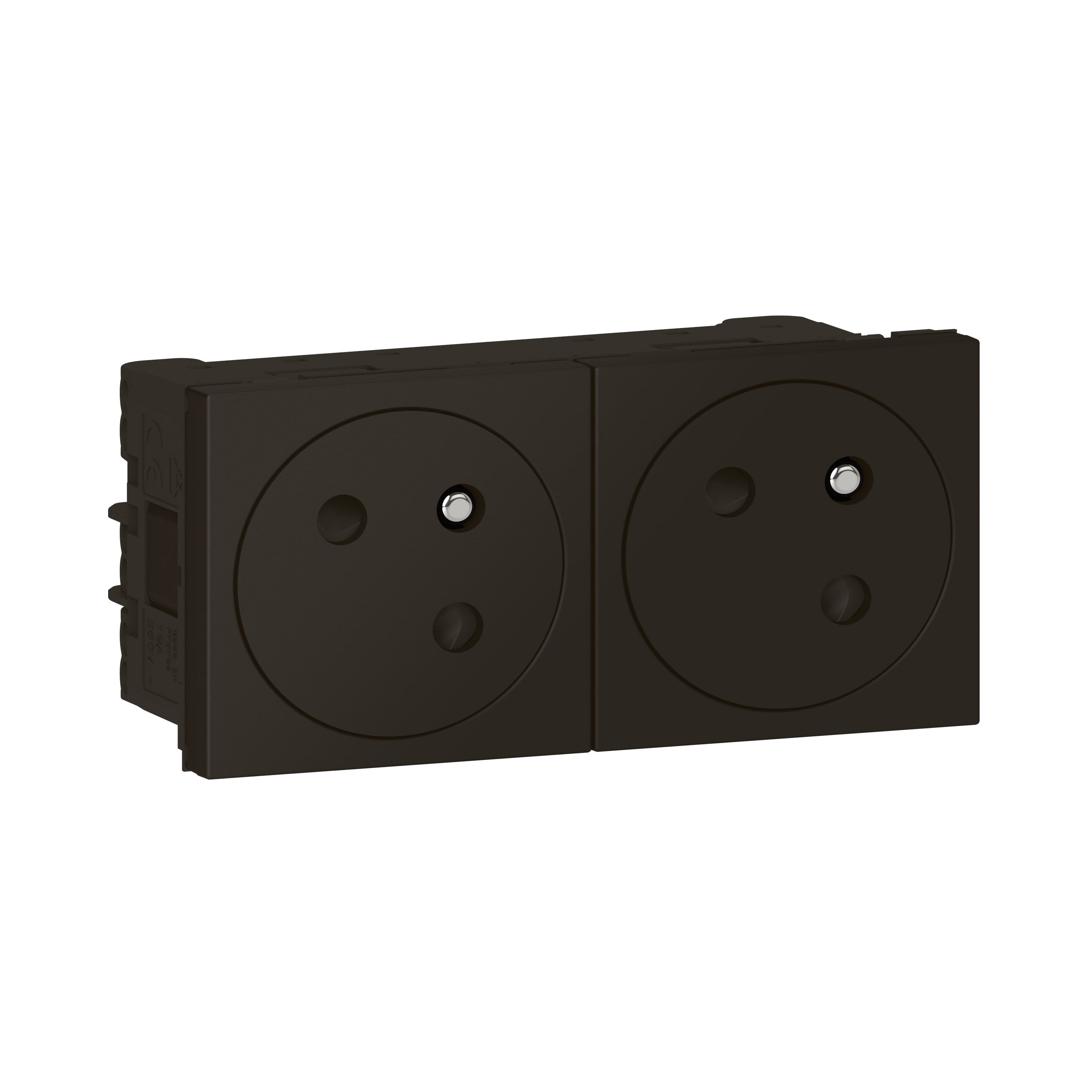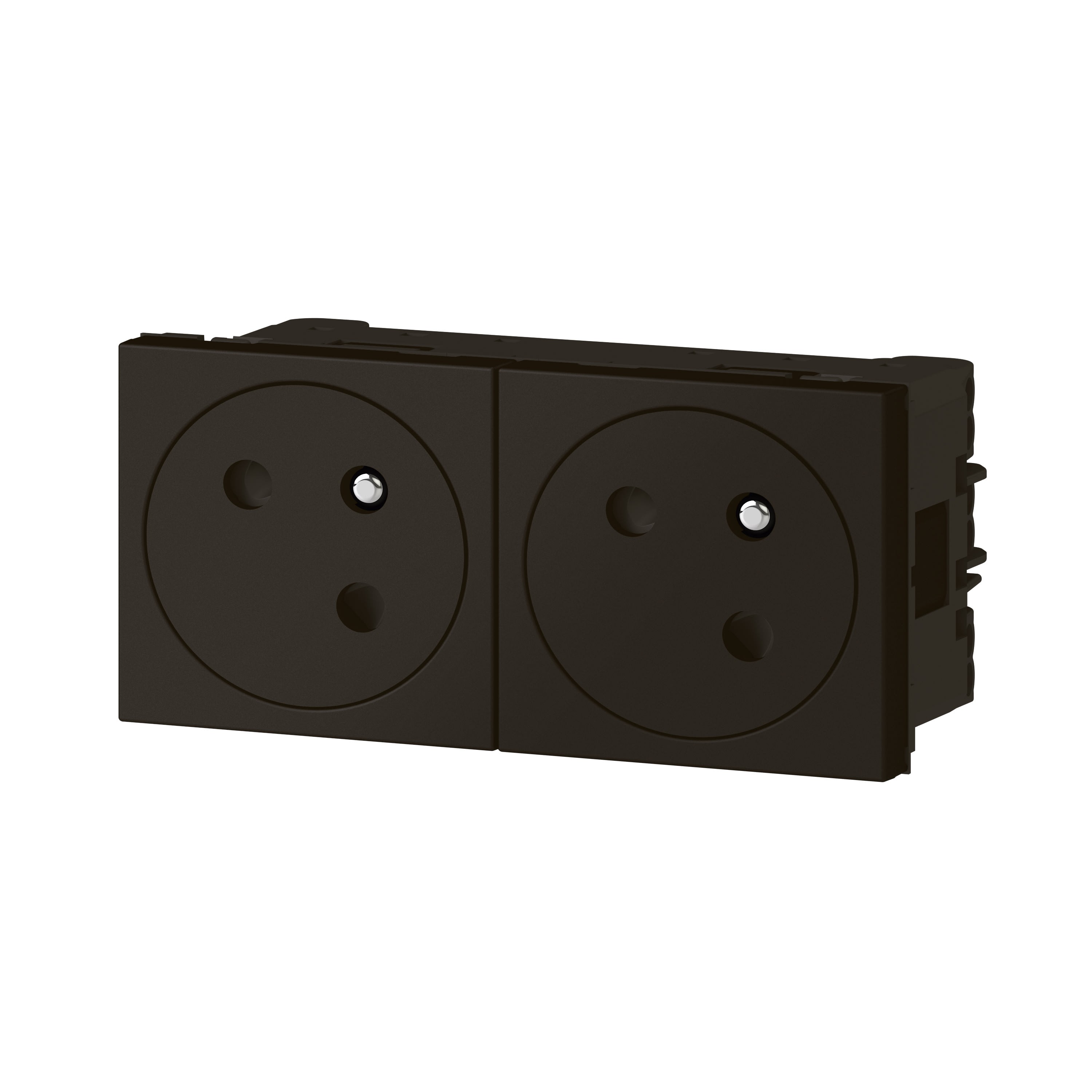 Prise de courant 2x2P+T Surface Mosaic Link 16A 230V à connexion latérale par bornes automatiques bi-stables - À équiper d'un support et d'une plaque Mosaic 4 modules - Noir mat RAL9017 L'inclinaison à 45° des puits de prise permet de gagner de la place lors du branchement de plusieurs appareils electriques ou electroniques volumineux Résistance aux chocs renforcée : indice IK07 Connexion par bornes automatiques à levier permettant la connexion rapide sans outil