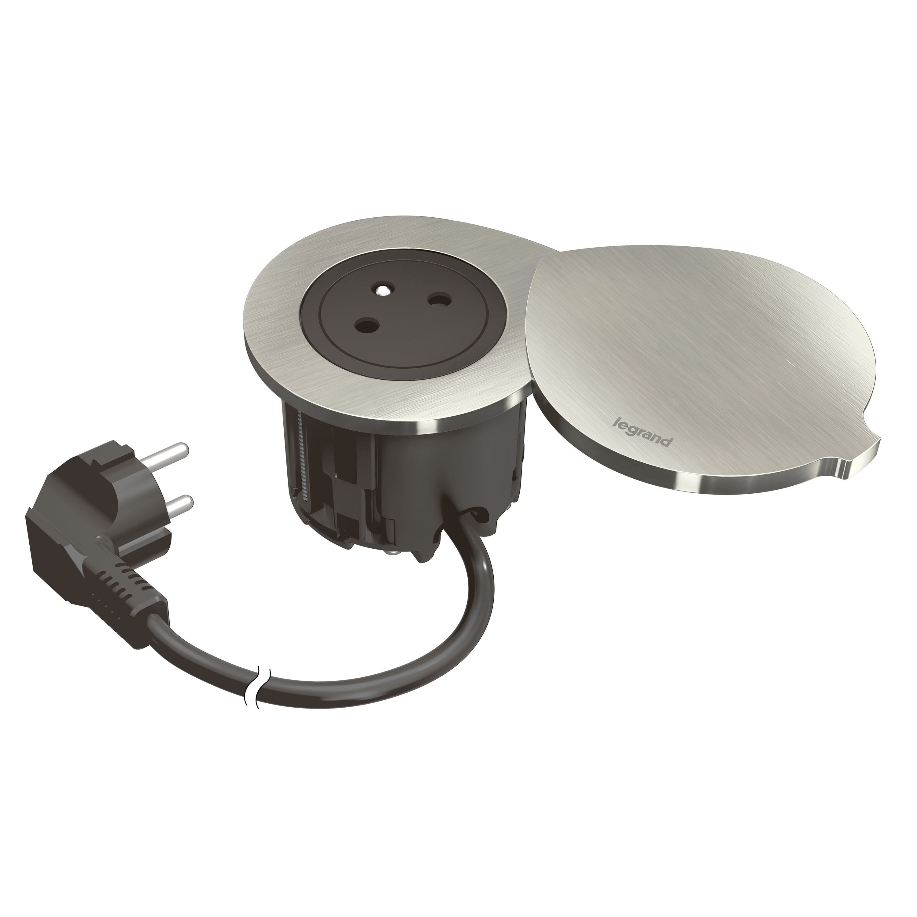 Disq 60 Incara avec prise de courant 2P+T Surface livré avec cordon de longueur 2m équipé d'une fiche 2P+T avec couvercle pivotant - finition noir Ø60mm à fixer sur tout type de support, même de faible épaisseur (1 mm minimum)