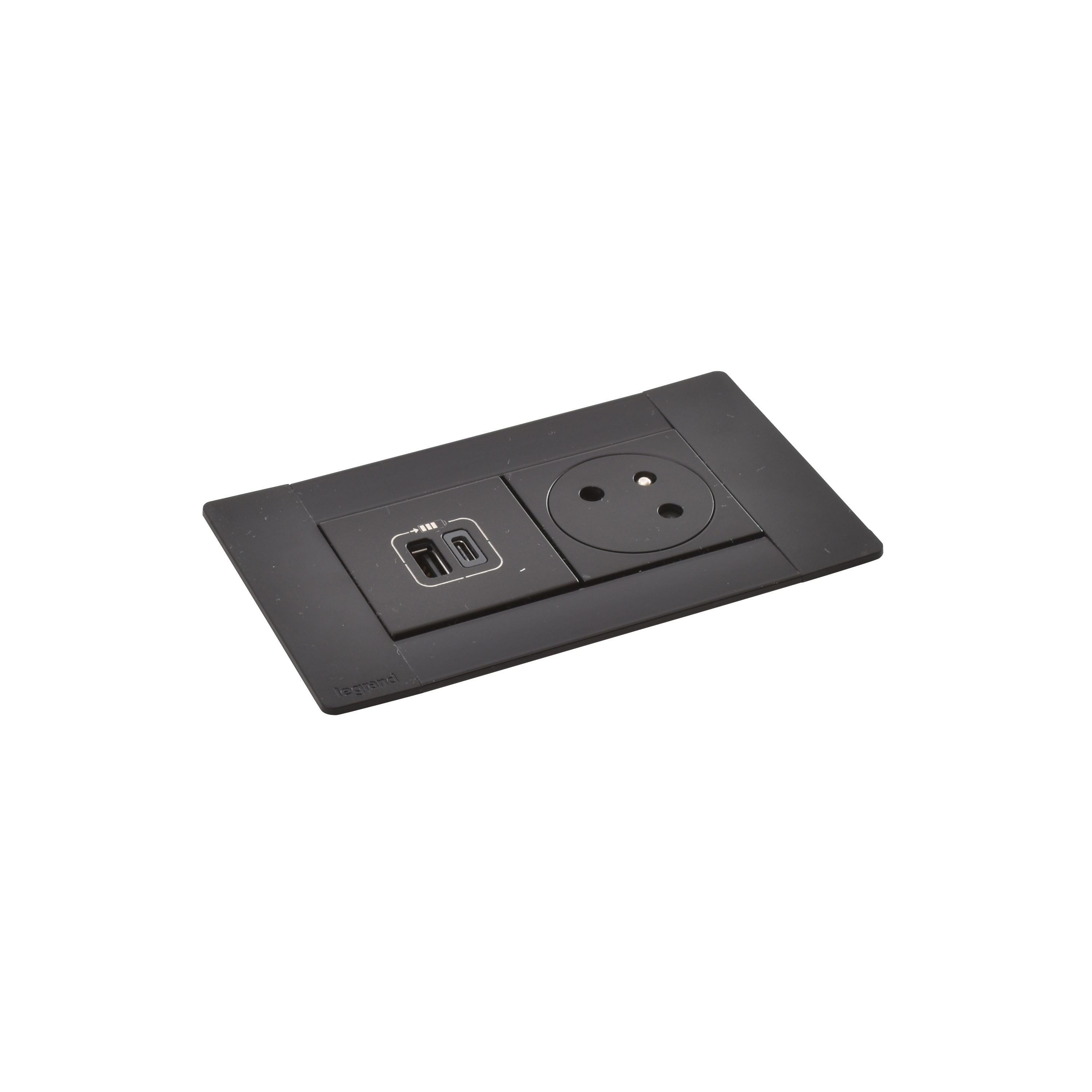 Multilink Incara 4 modules version horizontal pour encastrement dans mobilier équipé de 1 prise de courant Surface et 1 chargeur USB Type-A + Type-C - finition noir avec profondeur d'encastrement 80mm minimum