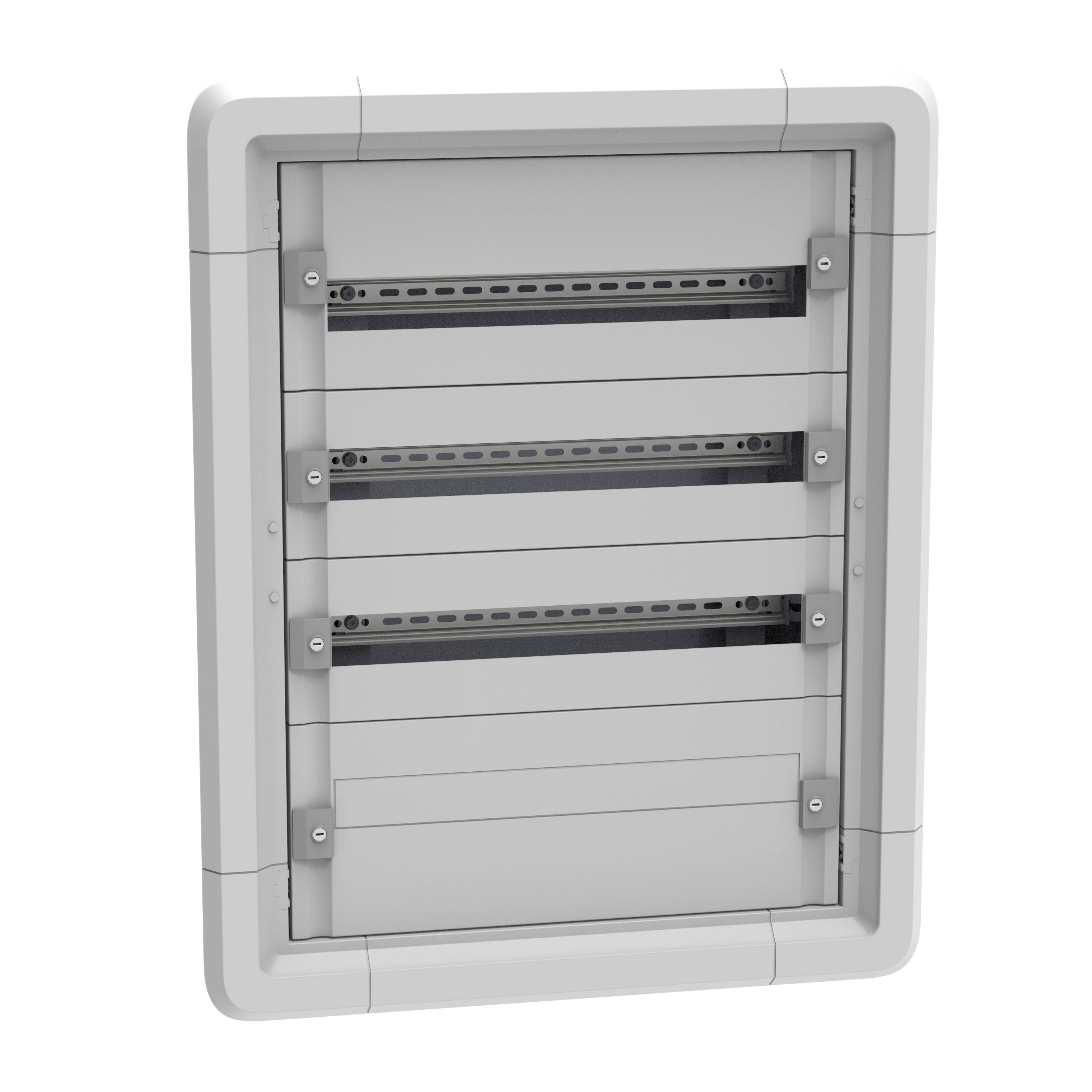 Dimensions : hauteur 845mm - largeur 670mm IP30 - IK04 avec plastrons et sans porte Châssis extractible avec montage sur rail DIN Equipé de : Rails DIN, plastrons isolants avec verrouillage 1/4 de tour (hauteur des plastrons supérieur et inférieur 200mm et hauteur du plastron central 150mm), barre laiton pour la mise à la terre et un bracelet de circulation de filerie vertical par rangée. Cadre en plastique RAL7035 et boîte d'encastrement en métal