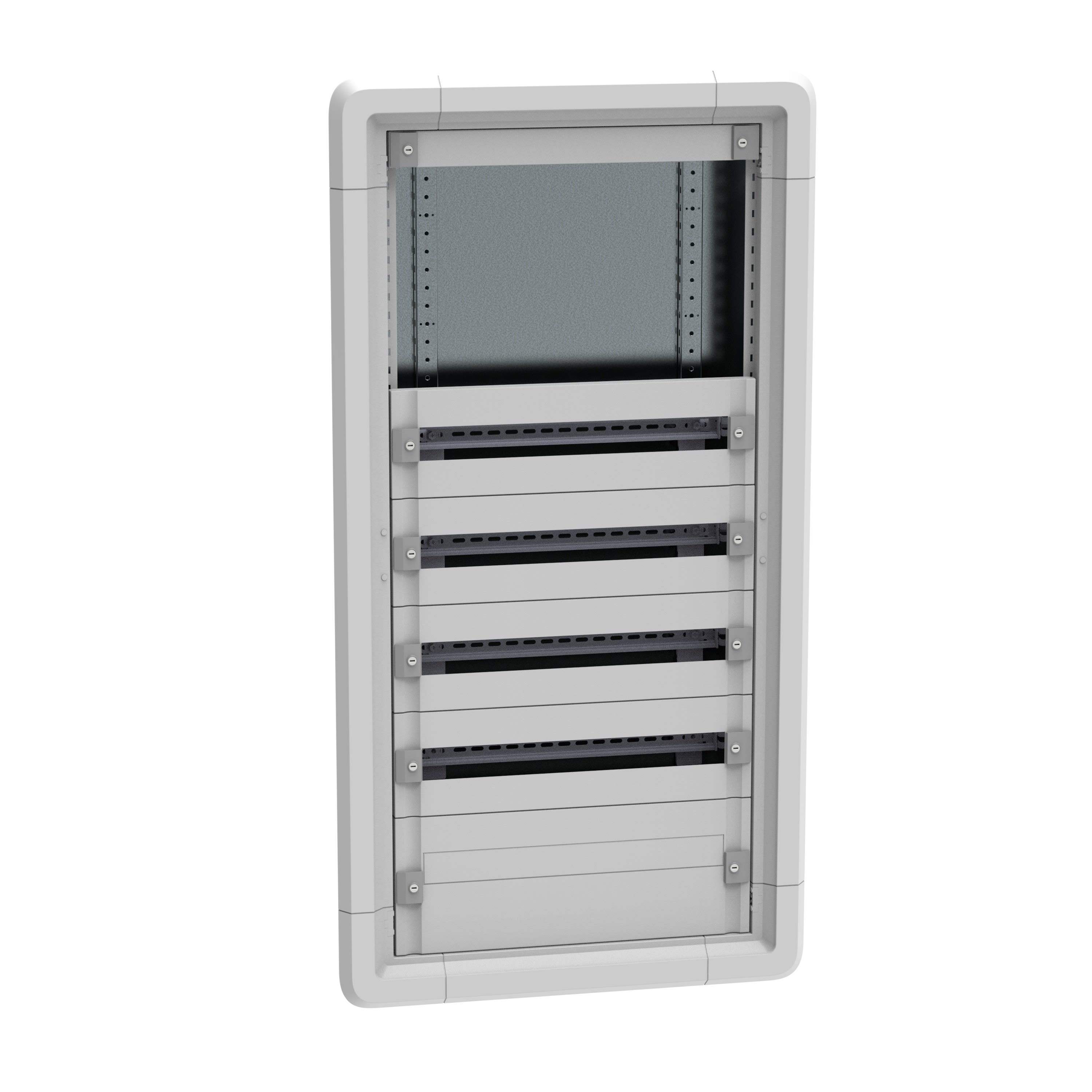 Dimensions : hauteur 1295mm - largeur 670mm IP30 - IK04 avec plastrons et sans porte Châssis extractible avec montage sur rail DIN Equipé de : Rails DIN, plastrons isolants avec verrouillage 1/4 de tour (hauteur du plastron supérieur 50mm, hauteur du plastron inférieur 200mm et hauteur du plastron central 150mm), barreau laiton pour la mise à la terre et un bracelet de circulation de filerie vertical par rangée. Cadre en plastique RAL7035 et boîte d'encastrement en métal