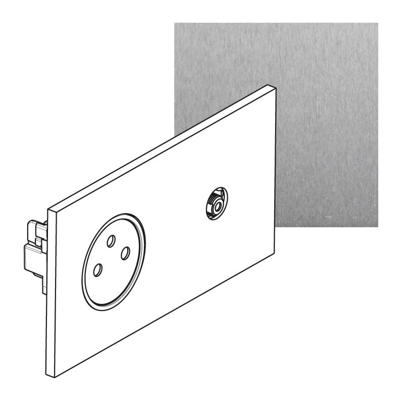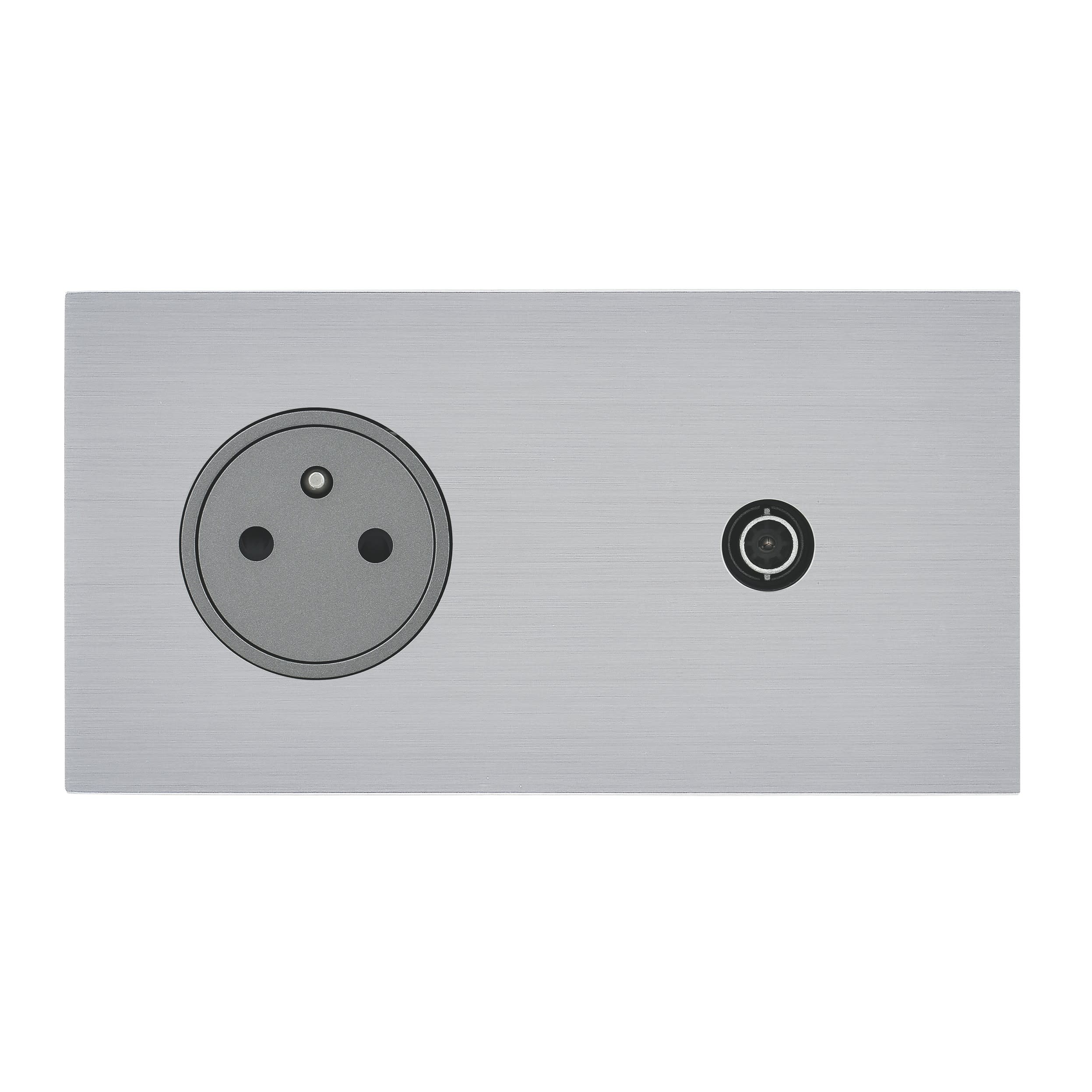 Prise 2P+T + TV Art d'Arnould Composée d'une prise 2P+T Surface gris magnésium 16A 250V et d'une prise TV simple Univers Epure Acier brossé Dimensions grand carrée double 80x151mm Se monte dans boîte d'encastrement 2 postes