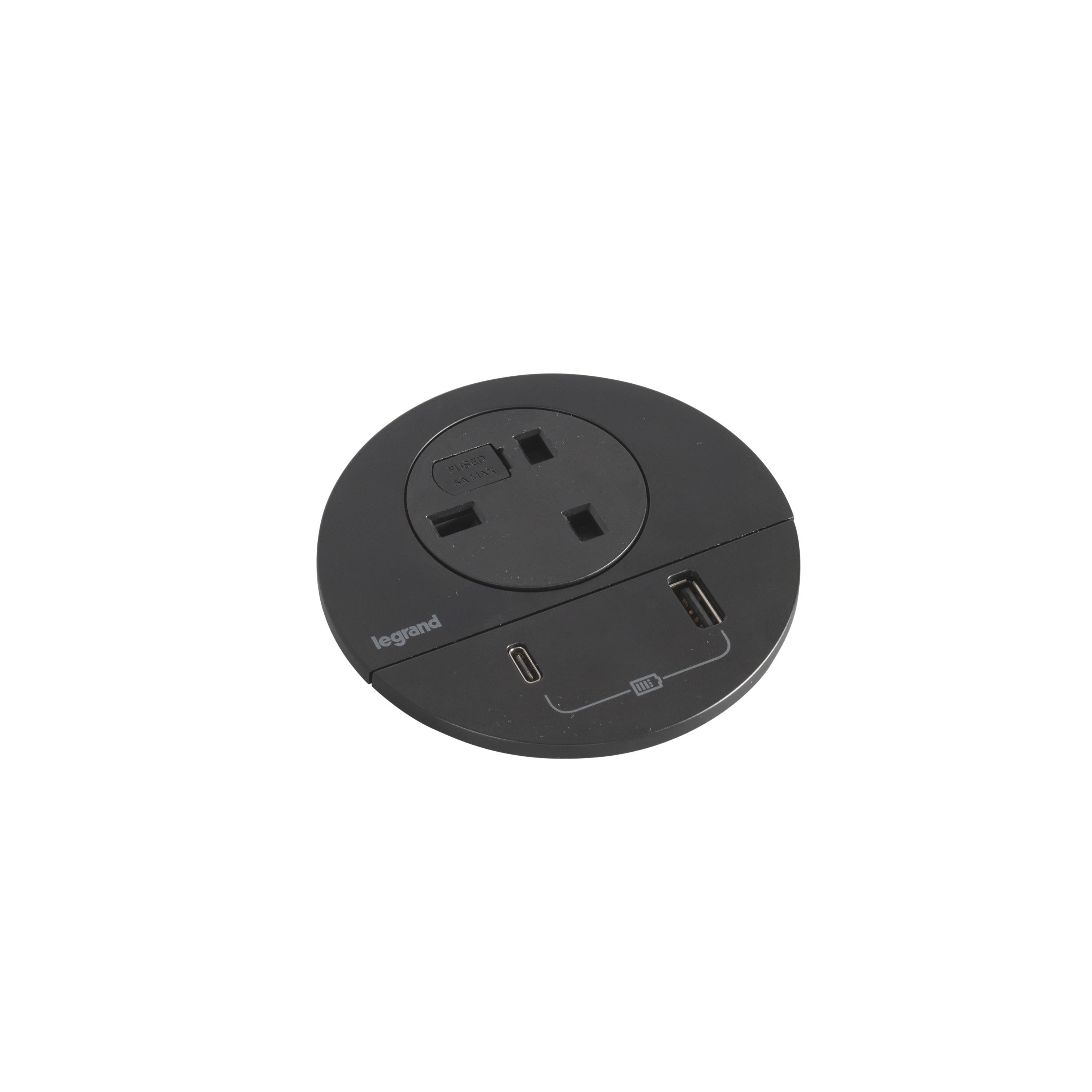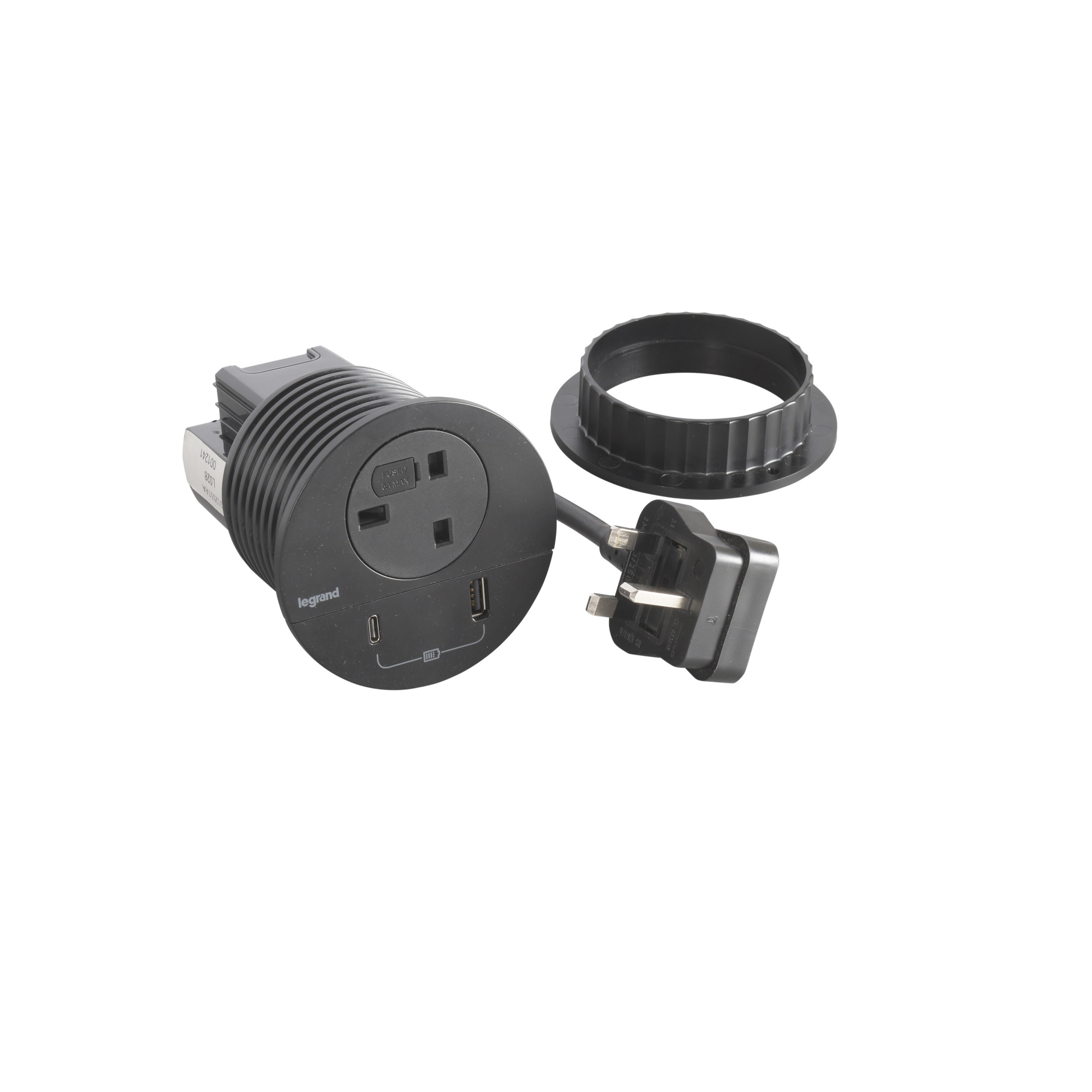 Solution d'électrification intégrée et peu encombrante, S'intègre dans un diamètre de 80mm..A encastrer dans du mobilier épaisseur 1-40mm, Livré avec bague de fixation avec pas rapide, Finition prise : noir, Finition plaque : noir