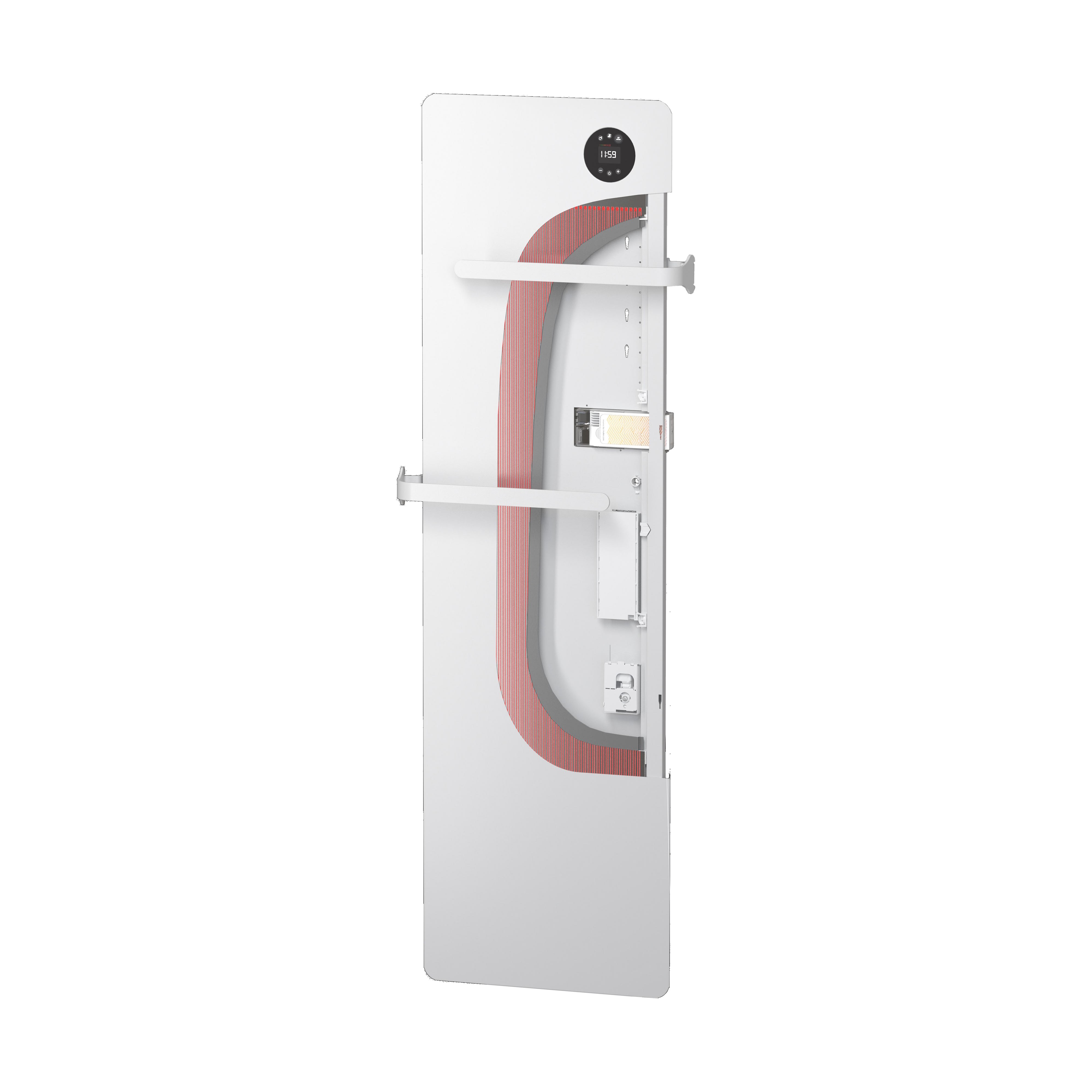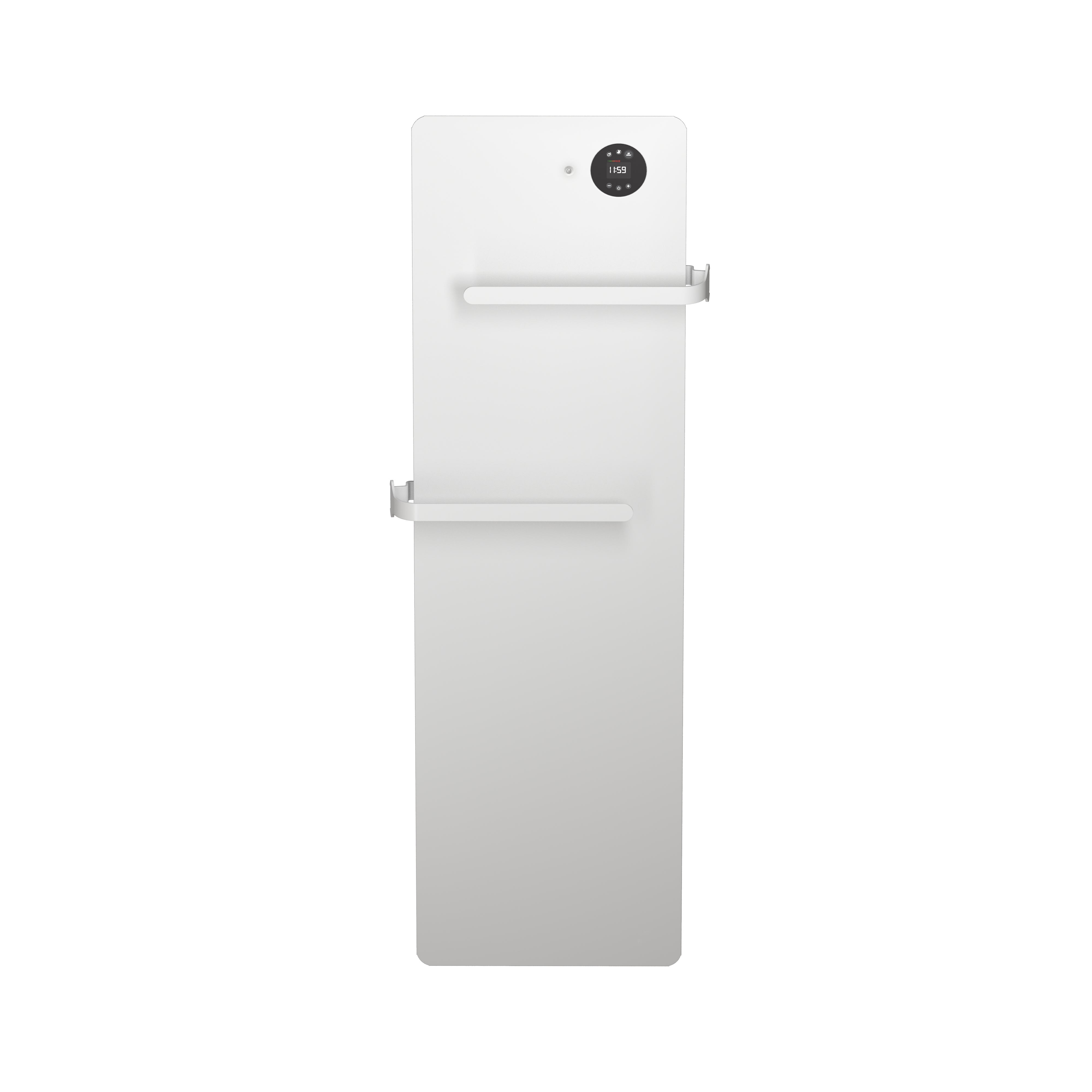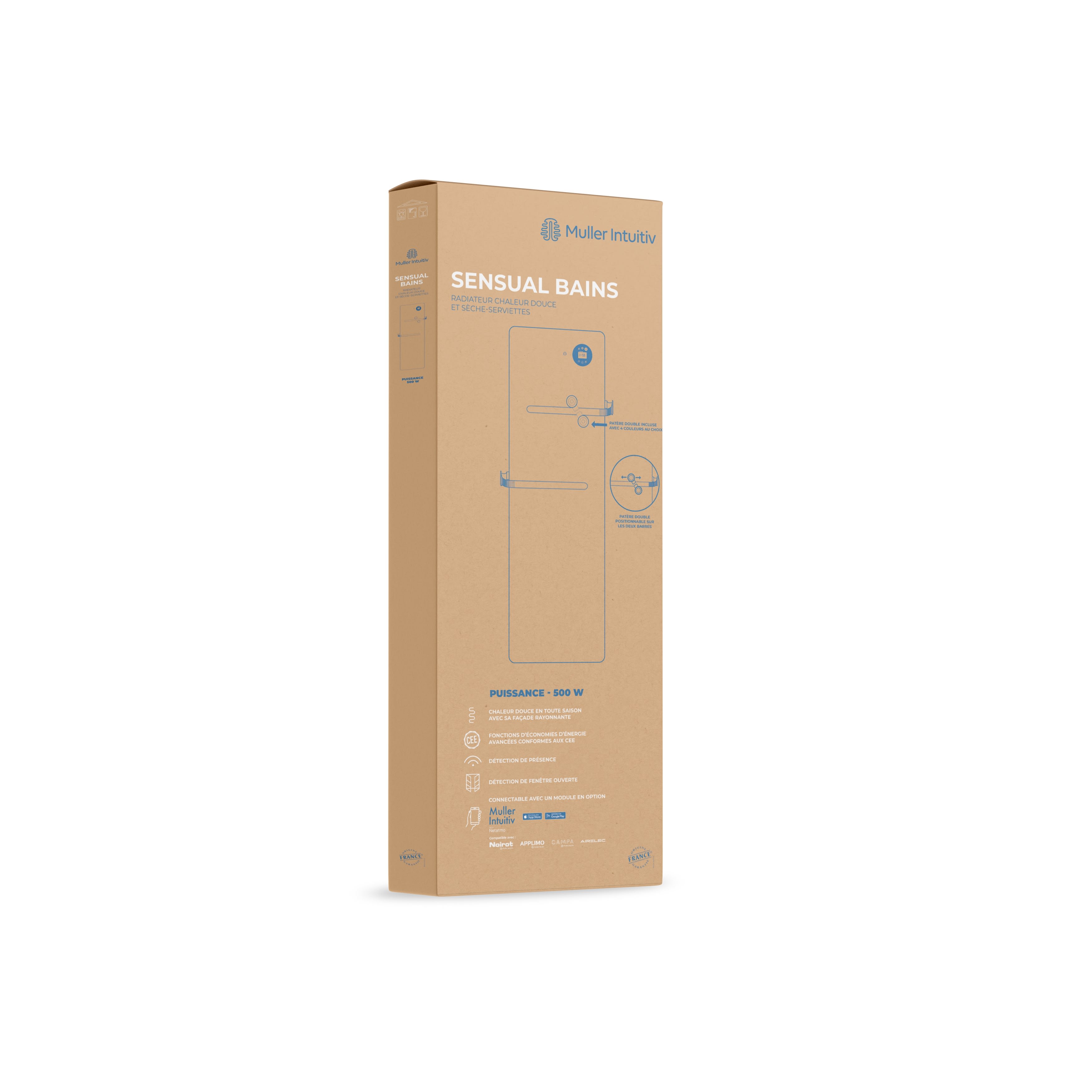 Avec une épaisseur au mur de seulement 6 cm Sensual bain bat les records de finesse. Il présente une grande surface de chauffe extra plane idéale pour chauffer finement et en douceur les salles de bains de tailles moyennes. Une très grande capacité d'étendage: Sensual bain dispose de 2 barres d'étendage avec accroche peignoirs intégré.2 patères modulables et personnalisables en couleurs (4 coloris au choix) Régulation électronique ultra précise, détection de présence, mode connecté avec intuis connect* SENSUAL bain est équipé du meilleur niveau de régulation pour piloter avec intelligence la salle de bains pièce à vivre. Un encombrement idéal pour occuper les murs étroits : 2 puissances 500 et 750W de hauteur 1,5 m pour une largeur de seulement 44 cm. Finition blanc satiné lisse (ral 9003) très agréable au touché et peu salissante.