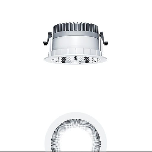 Plafonnier encastré à LED R150 (luminaire complet), avec Distribution lumineuse symétrique et extensive de la lumière (69 °), une efficacité maximale du luminaire, une technique d'éclairage downlight optimale ; une grande durabilité en raison d'une structure modulaire maximale continue et de composants échangeables. Module LED interchangeable, Distribution lumineuse symétrique et extensive de la lumière, Rendu des couleurs Ra > 90 (R9 > 50), température de couleur 3000 K ; Tolérance de la couleur (MacAdam intial): 2 ; Puissance du luminaire: 21,2 W ; Flux lumineux du luminaire: 2880 lm ; ; Efficacité lumineuse du luminaire: 136 lm/W ; Durée de vie utile médiane: L80 100000 h à 25 °C + L90 50000 h à 25 °C, avec convertisseur LED enfichable séparé, Luminaire commutable on/off ; ; unité réflecteur haut de gamme se fixant sur la chambre lumineuse modulaire à LED grâce à la fermeture à baïonnette ; chambre lumineuse à LED extrêmement efficace intégrée dans la gestion thermique passive optimisée en Gestion thermique passive en aluminium recyclé injecté sous pression, réflecteur/collerette en Polycarbonate (PC) de grande qualité et résistant aux UV ; réflecteur : à facettes, aluminisé, grand brillant, sans irisation ; ; collerette : blanc ; collerette d’encastrement en Polycarbonate (PC) ; blanc ; degré de protection : IP54_IP20 ; ; câblage du luminaire sans halogène ; raccordement : Bornier tripolaire à enfichage ; Câblage en dérivation possible ; ; tension secteur : 220-240 V / 0/50/60 Hz, compatible avec une batterie centralisée à courant continu de 220-240 V DC ; ; Montage rapide sans outil à l'aide de clips de fixation anti-dérapants pour épaisseurs de plafond de 1 à 40 mm (selon les modèles de luminaires) grâce à des barrettes de maintien interchangeables ; montage rapide sans outil de l'unité d'éclairage à l’aide d'une fermeture à baïonnette, découpe de plafond : 150 mm , profondeur d'encastrement : 100 mm; poids : 0,71 kg ; ;Pour des applications dans les bureaux conformément à la norme EN12464 avec UGR 19 (réflecteur alumisé)