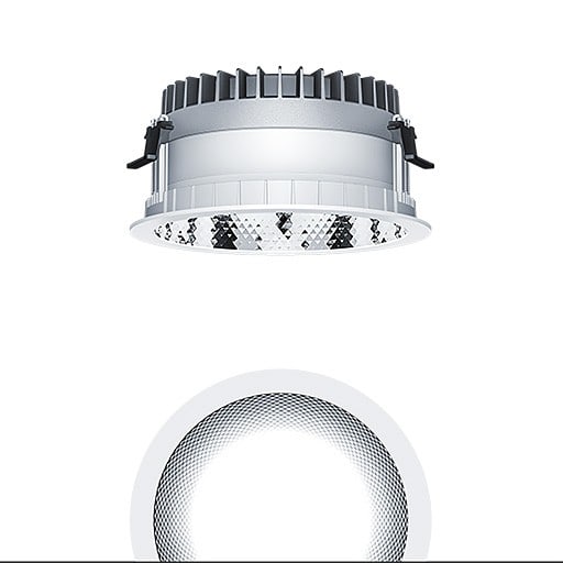 Plafonnier encastré à LED R200 (luminaire complet), avec Distribution lumineuse symétrique et extensive de la lumière (80 °), une efficacité maximale du luminaire, une technique d'éclairage downlight optimale ; une grande durabilité en raison d'une structure modulaire maximale continue et de composants échangeables. Module LED interchangeable, Distribution lumineuse symétrique et extensive de la lumière, Rendu des couleurs Ra > 80, température de couleur 3000 K ; Tolérance de la couleur (MacAdam intial): 2 ; Puissance du luminaire: 38,1 W ; Flux lumineux du luminaire: 5160 lm ; ; Efficacité lumineuse du luminaire: 135 lm/W ; Durée de vie utile médiane: L80 100000 h à 25 °C + L90 50000 h à 25 °C, avec convertisseur LED enfichable séparé, Luminaire commutable on/off ; ; unité réflecteur haut de gamme se fixant sur la chambre lumineuse modulaire à LED grâce à la fermeture à baïonnette ; chambre lumineuse à LED extrêmement efficace intégrée dans la gestion thermique passive optimisée en Gestion thermique passive en aluminium recyclé injecté sous pression, réflecteur/collerette en Polycarbonate (PC) de grande qualité et résistant aux UV ; réflecteur : à facettes, aluminisé, grand brillant, sans irisation ; ; collerette : blanc ; collerette d’encastrement en Polycarbonate (PC) ; blanc ; degré de protection : IP54_IP20 ; ; câblage du luminaire sans halogène ; raccordement : Bornier tripolaire à enfichage ; Câblage en dérivation possible ; ; tension secteur : 220-240 V / 0/50/60 Hz, compatible avec une batterie centralisée à courant continu de 220-240 V DC ; ; Montage rapide sans outil à l'aide de clips de fixation anti-dérapants pour épaisseurs de plafond de 1 à 40 mm (selon les modèles de luminaires) grâce à des barrettes de maintien interchangeables ; montage rapide sans outil de l'unité d'éclairage à l’aide d'une fermeture à baïonnette, découpe de plafond : 200 mm , profondeur d'encastrement : 120 mm; poids : 1,1 kg ; ;