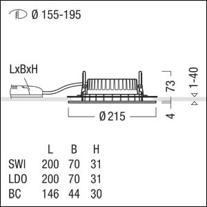 Plafonnier encastré à LED R150 (luminaire complet), avec (80 °), une efficacité maximale du luminaire, une technique d'éclairage downlight optimale ; une grande durabilité en raison d'une structure modulaire maximale continue et de composants échangeables. Module LED interchangeable, Rendu des couleurs Ra > 90 (R9 > 50), température de couleur 4000 K ; Tolérance de la couleur (MacAdam intial): 2 ; Puissance du luminaire: 21,5 W ; Flux lumineux du luminaire: 3160 lm ; ; Efficacité lumineuse du luminaire: 147 lm/W ; Durée de vie utile médiane: L80 100000 h à 25 °C + L90 50000 h à 25 °C, avec convertisseur LED enfichable séparé, Luminaire pilotable via DALI (via DALI uniquement) ; avec fonction DC, réglable de 1 à 100 %, configurable NFC, compatible SwitchDIM ; unité réflecteur haut de gamme se fixant sur la chambre lumineuse modulaire à LED grâce à la fermeture à baïonnette ; chambre lumineuse à LED extrêmement efficace intégrée dans la gestion thermique passive optimisée en Gestion thermique passive en polycarbonate thermoconducteur de grande qualité, réflecteur/collerette en Polycarbonate (PC) de grande qualité et résistant aux UV ; réflecteur : aluminisé, haut brillant, sans irisation ; ; collerette : blanc ; collerette d’encastrement en Polycarbonate (PC) ; blanc ; degré de protection : IP43_IP20 ; ; câblage du luminaire sans halogène ; raccordement : Bornier à 5 pôles à enfichage ; Câblage en dérivation possible ; ; tension secteur : 220-240 V / 0/50/60 Hz, compatible avec une batterie centralisée à courant continu de 220-240 V DC ; ; Montage rapide sans outil à l'aide de clips de fixation anti-dérapants pour épaisseurs de plafond de 1 à 25 mm (selon les modèles de luminaires) grâce à des barrettes de maintien interchangeables ; montage rapide sans outil de l'unité d'éclairage à l’aide d'une fermeture à baïonnette, découpe de plafond : 155 mm -195, profondeur d'encastrement : 72 mm; poids : 0,98 kg ; ;Faible profondeur d'encastrement lors d’une utilisation dans un espace réduit dans le plafond.