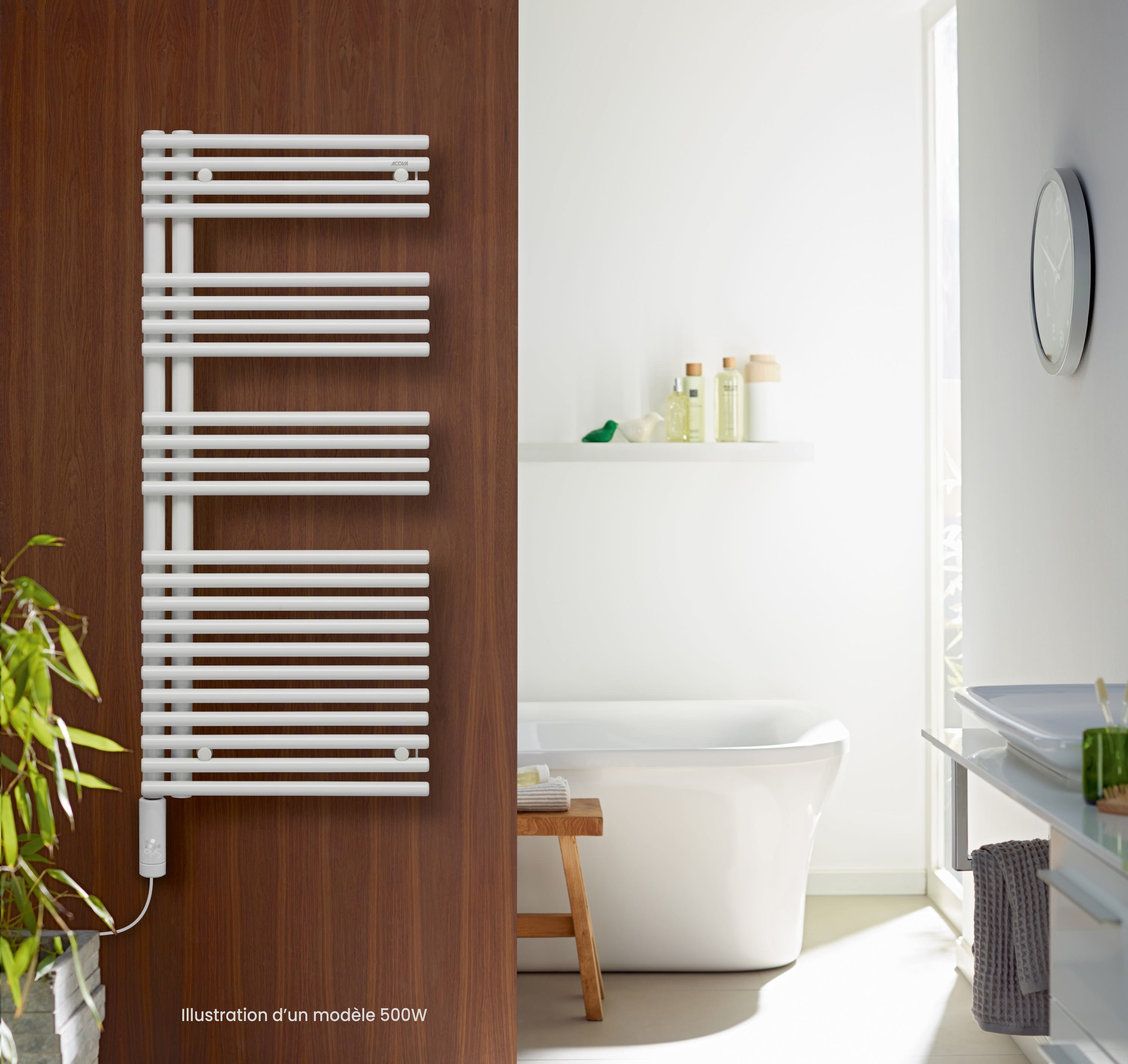 Design asymétrique : facilite la pose des serviettesLongévité : fabriqué en acier protégé par un traitement anticorrosion et une peinture longue durée pour une résistance accrue.Astuce aménagement : existe en faible large (396 mm)Réglage facile des modes, de la température et du boost grâce à la molette rotative de sélection et l'affichage matriciel à LED.Connectivité Bluetooth pour piloter le sèche-serviettes depuis son smartphone et accéder aux fonctionnalités avancées dont la programmation hebdomadaireConfort : chaleur homogène pour la salle de bains et les serviettes.