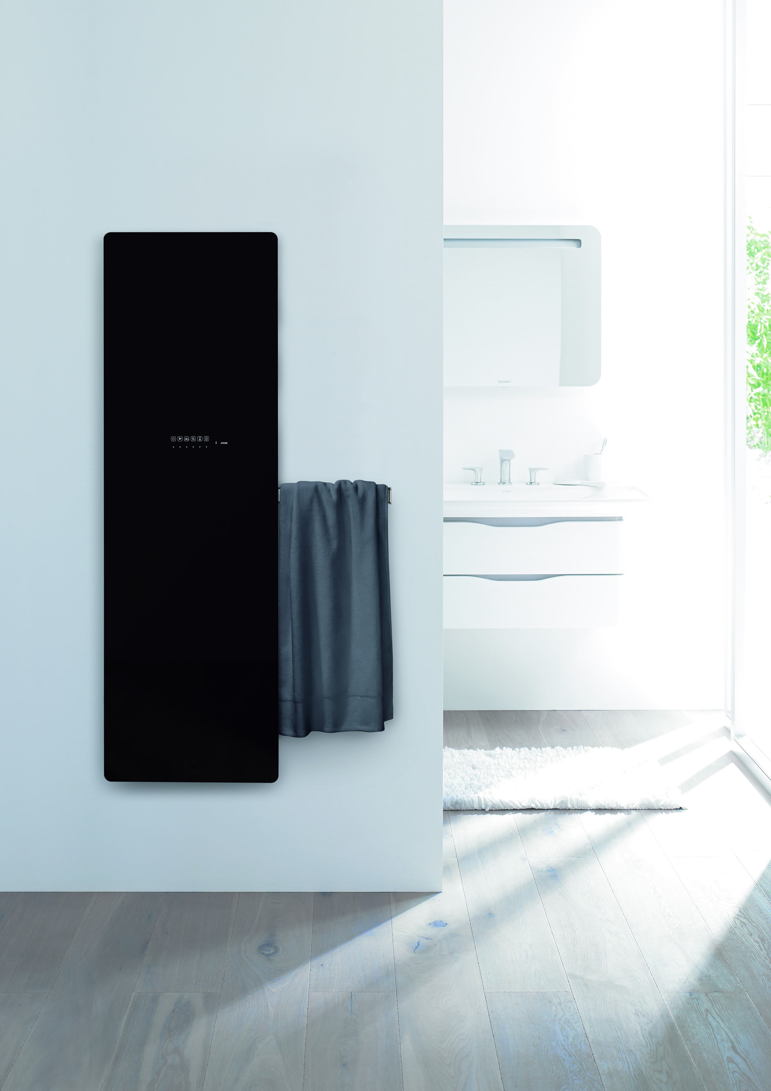 Les serviettes sèchent en toute discrétion grâce aux barres porte-serviettes rétractables. Avec surface en verre en finition noire, blanc ou miroir. Existe en version électrique.