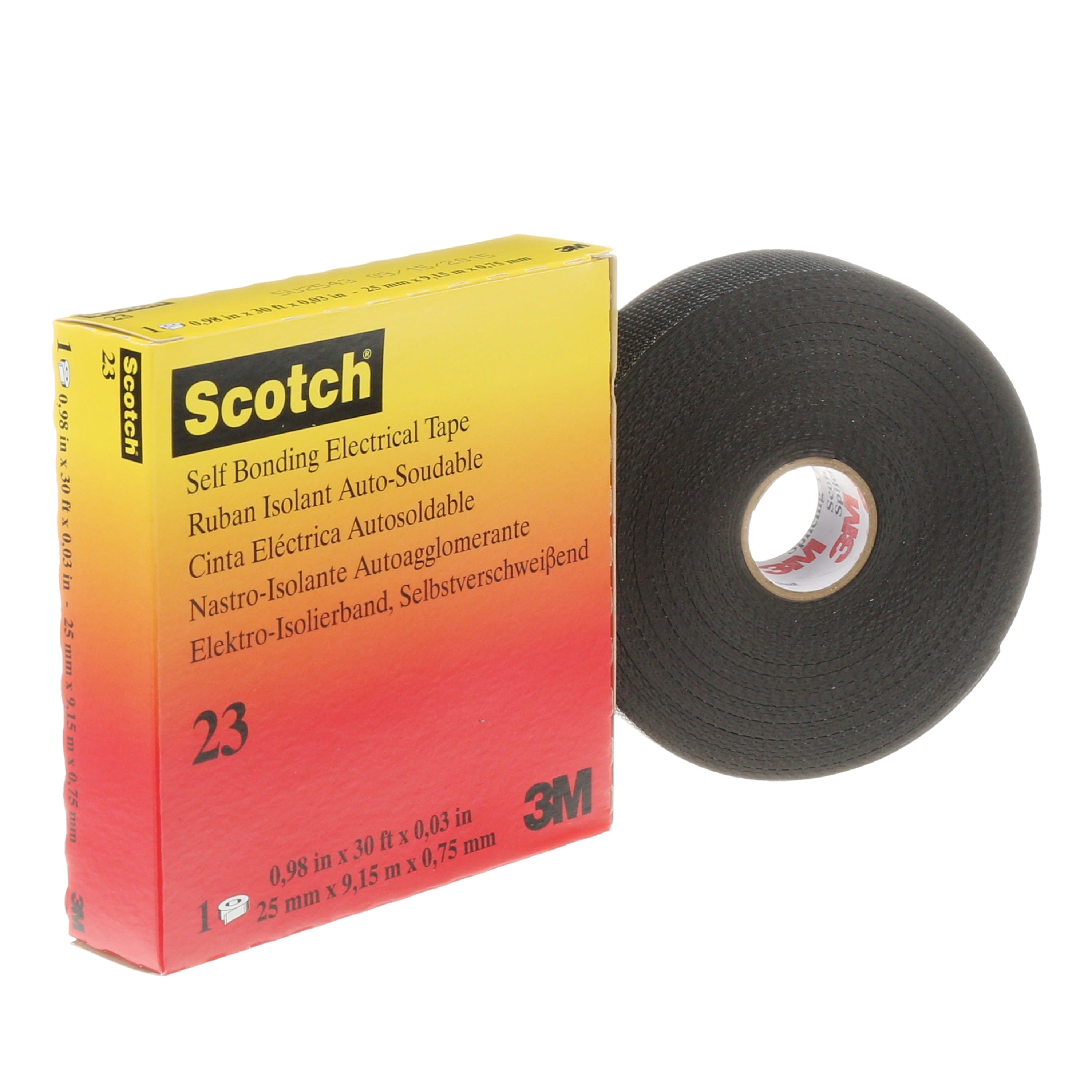 Rubans électriques - Le ruban Scotch® 23 est un ruban élastomère de couleur noire isolant électriques à base d`EPR (Ethylène, Propylène, Rubber) d`épaisseur 0.75mm, muni d`un intercalaire plastique blanc. Il a une excellente mémoire plastique, il est autosoudable : les couches de ruban se soudent en une masse homogène après application. Excellente résistance aux UV et à l`ozone. Il est sans halogène. Ruban élastomère de couleur noire isolant électrique à base d’EPR (Ethylène - Propylène - Rubber) d’épaisseur 0,75 mm, muni d’un intercalaire. Reconstitution d’isolant de câbles jusqu’à une tension de 69 kV. Frettage : Associé au ruban tricot de cuivre étamé Scotch 24 en remplacement des soudures. Réalisation de bouchons d’étanchéité autour de câbles et conduits divers. Autosoudable : les couches du ruban se soudent en une masse homogène après application. Excellente résistance à l’ozone. Compatibilité avec tous les isolants de câbles synthétiques et avec les isolants de câbles papier imprégné à matière non migrante. Le ruban est sans halogène.