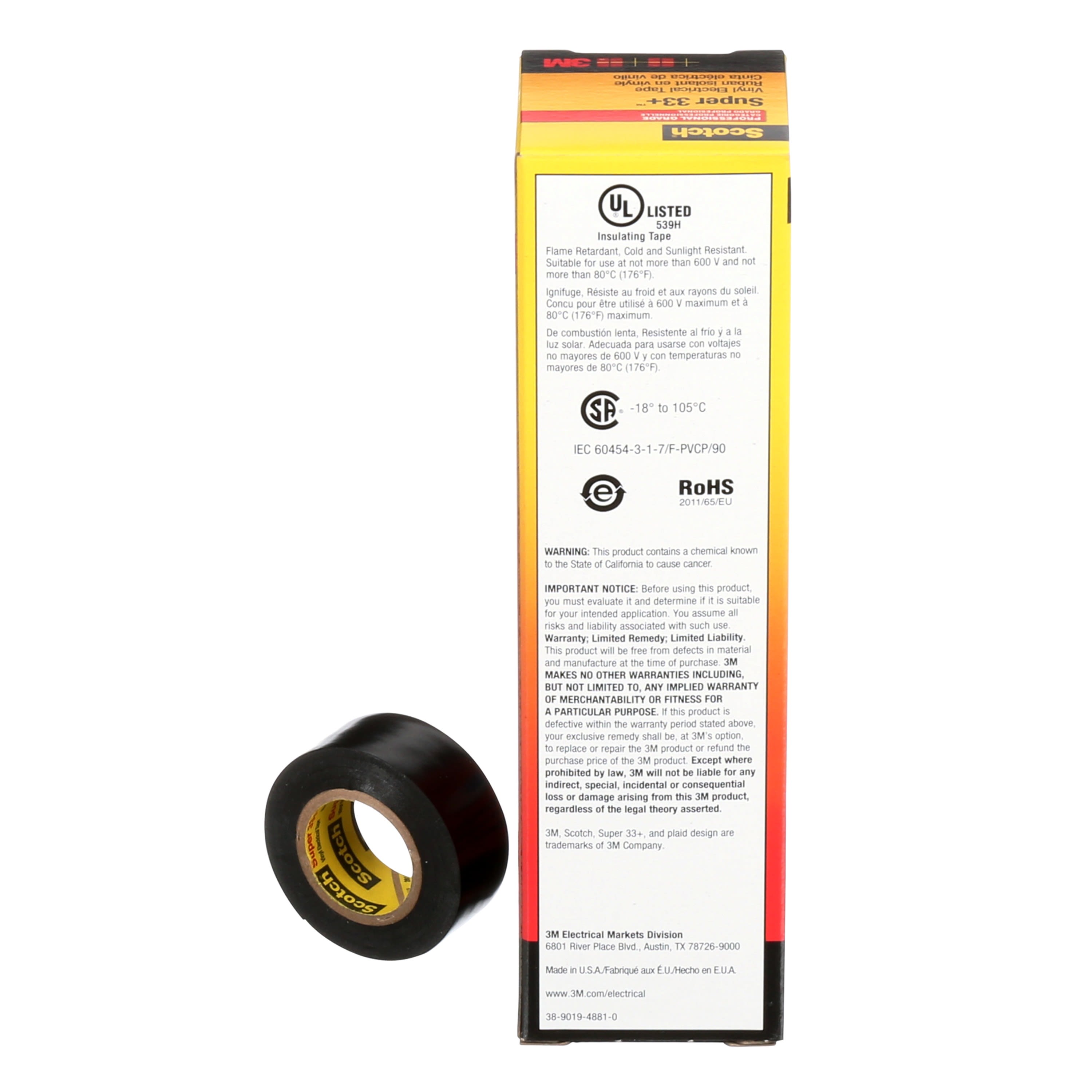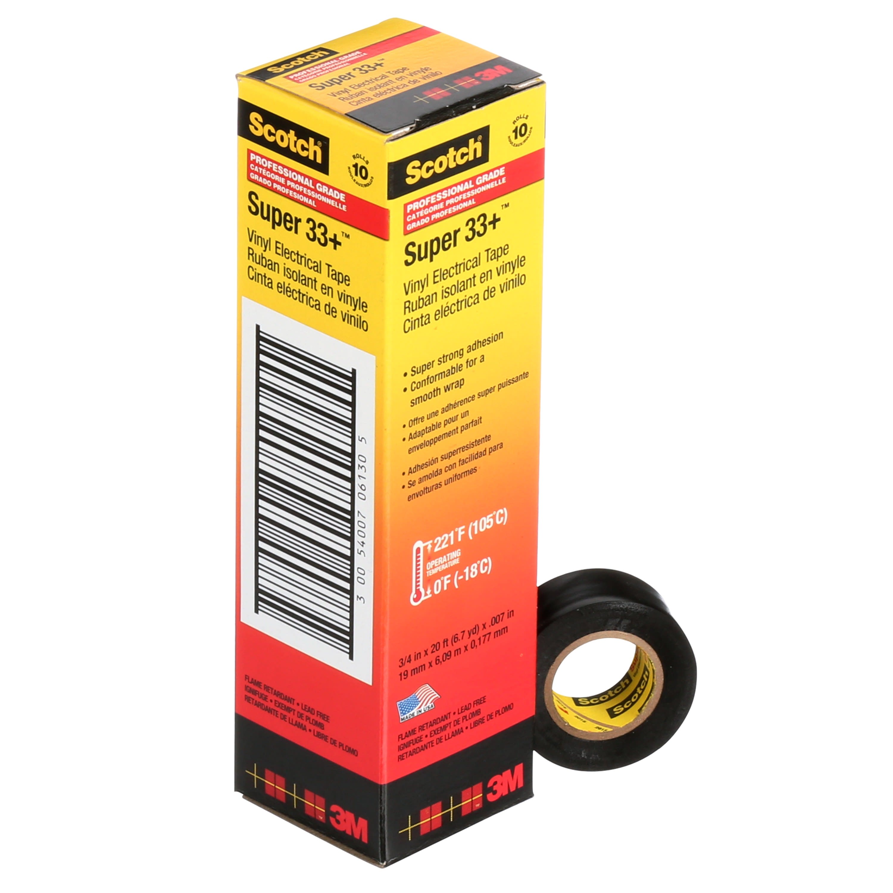 Rubans électriques - Le ruban Scotch® Super 33+ noir hautes performances possède une excellente conformabilité. Il peut être mis en oeuvre jusqu’à des températures de -18°C sans se déchirer. Le ruban Scotch® Super 33+ résiste aux UV, à l’humidité, aux alcalis et à la plupart des acides et solvants. Ruban vinyle Scotch® Super 33+ hautes performances doté d’un puissant adhésif sensible à la pression. Son épaisseur de 0,18 mm garantit son excellente souplesse. Application en intérieur et en extérieur pour reconstitution de gaines de câble BT ou HT, compatible avec l’isolation synthétique des câbles, les élastomères (Scotchfil-Scotch® 23) et les résines 3M. Excellente tenue mécanique et souplesse, permettant sa mise en oeuvre de -18°C à +60°C. Il est conçu pour rester performant dans des conditions extrêmes de température ambiante de -40°C à +105°C (Classe A). Résistant aux U.V, aux acides, aux alcalis. Auto-extinguible, résistant aux intempéries. Il est non propagateur de la flamme.