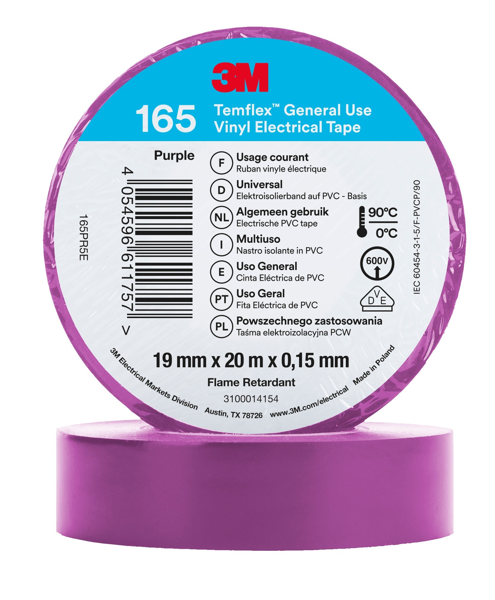 3M Electricite - Temflex 165 Ruban d'isolation électrique 19mm x 20m épaisseur 0,15mm Violet - 80573N