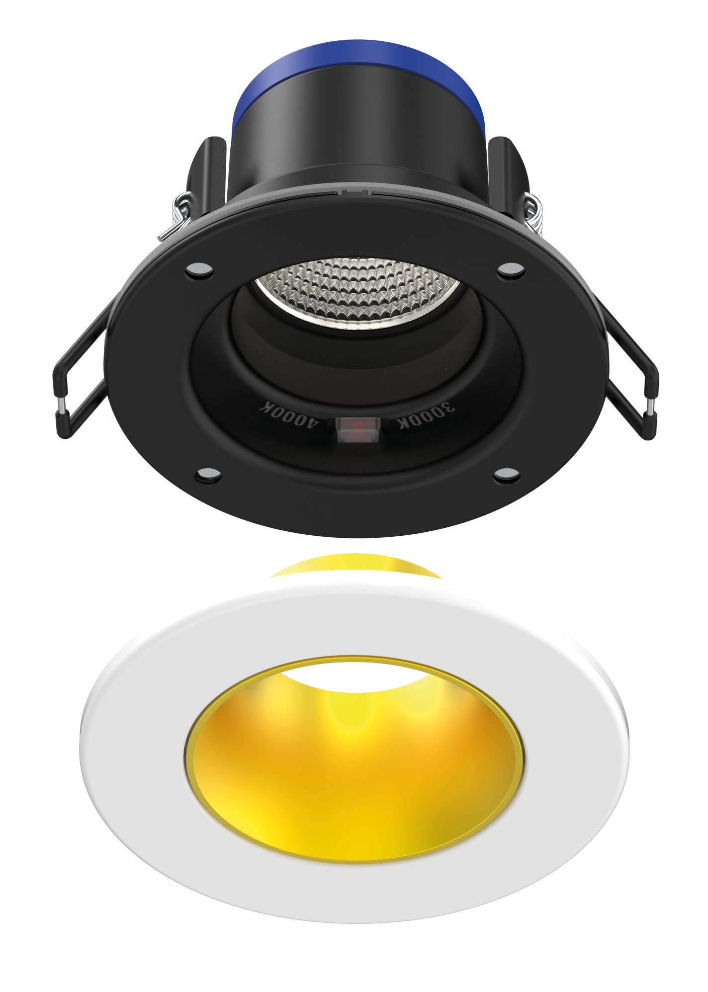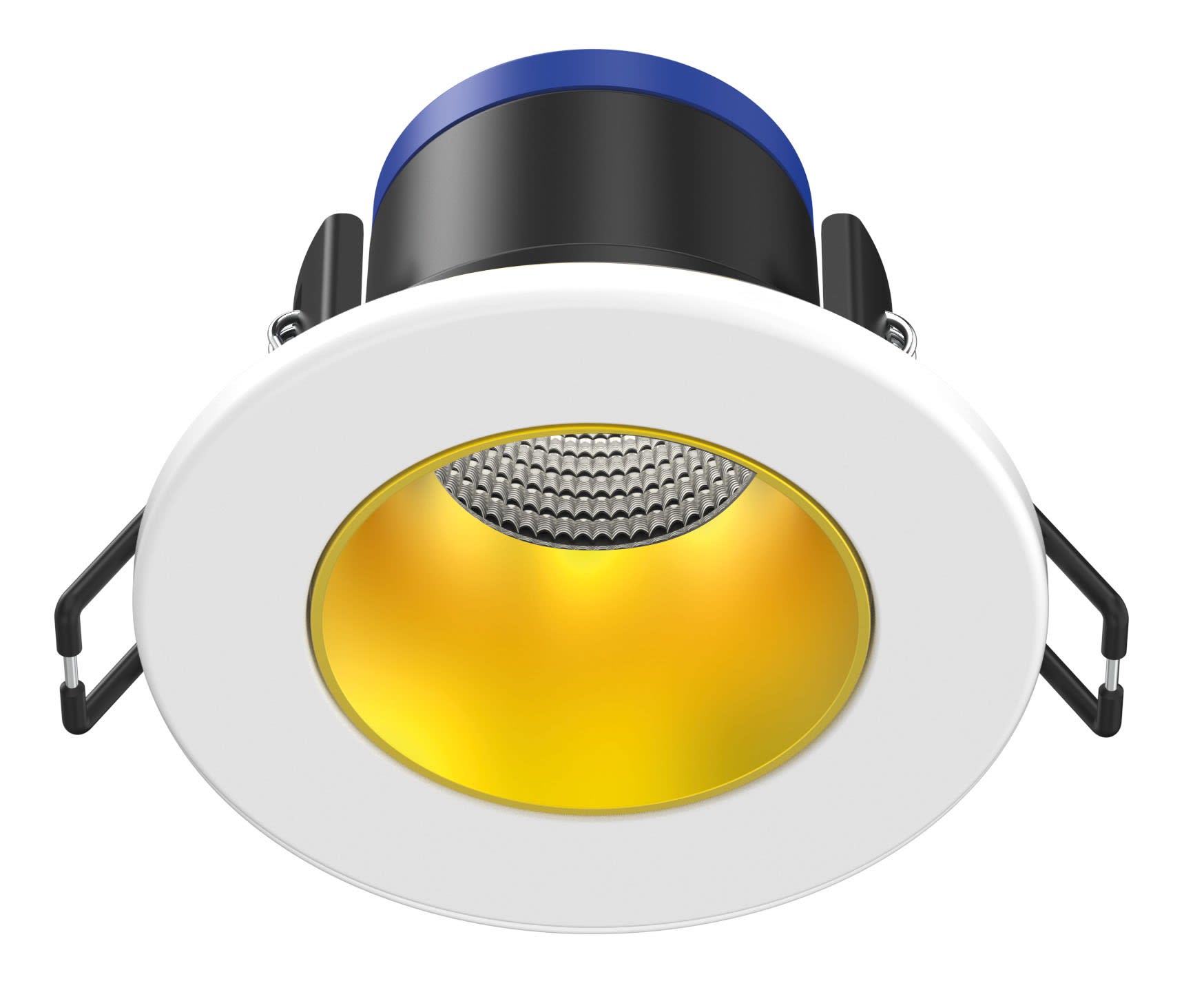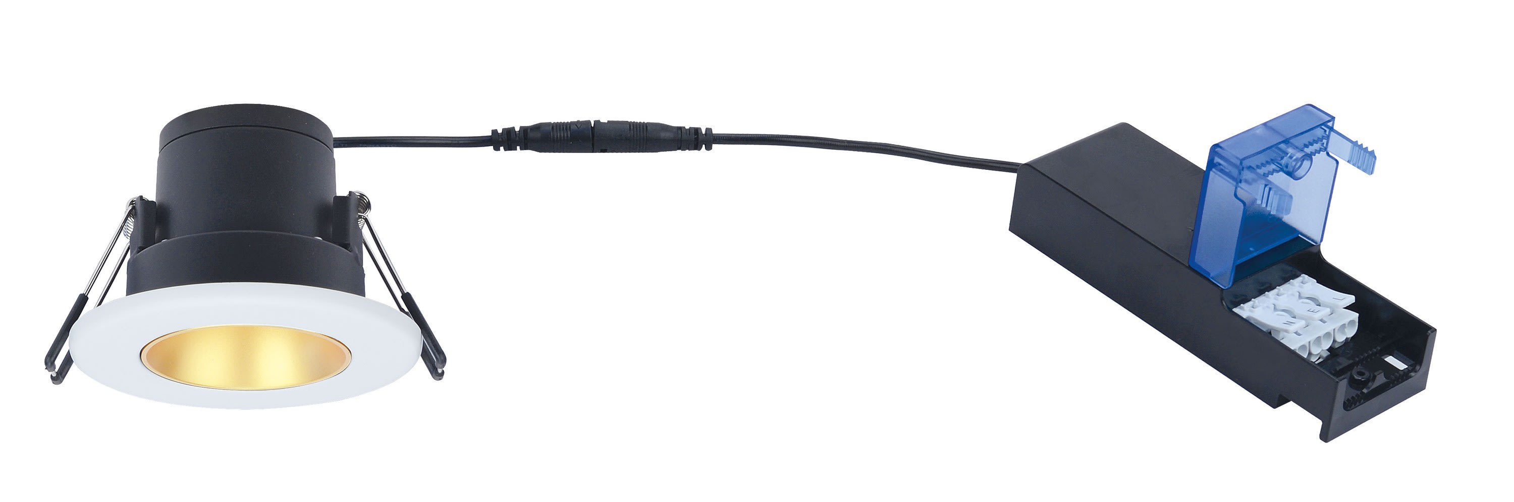 Encastrement standard (68mm) pour boîte DCL, tout type de plafond, avec recouvrement de 90mm - IP65, compatible Volume 1, idéal pour les pièces humides (Cuisine, Salle bain, Toilettes, etc) - Dimmable, convient pour les variateurs - Compatible norme RT2012, bâtiment BBC - Recouvrable par tous types d?isolants - Faisceau de 40° - Durée de vie de 50'000 heures - Alimentation déportée avec bornier de connexion automatique déporté et repiquable, pour un montage simplifié rapide et sans outils - Technologie CCT ARIC?: deux températures de couleur dans un seul produit avec commutation en face avant pour sélection de couleur possible après la pose. - Collerette décorative Blanc extérieur / Doré intérieure de finition aimantée - Taux d?éblouissement optimisé avec UGR<19