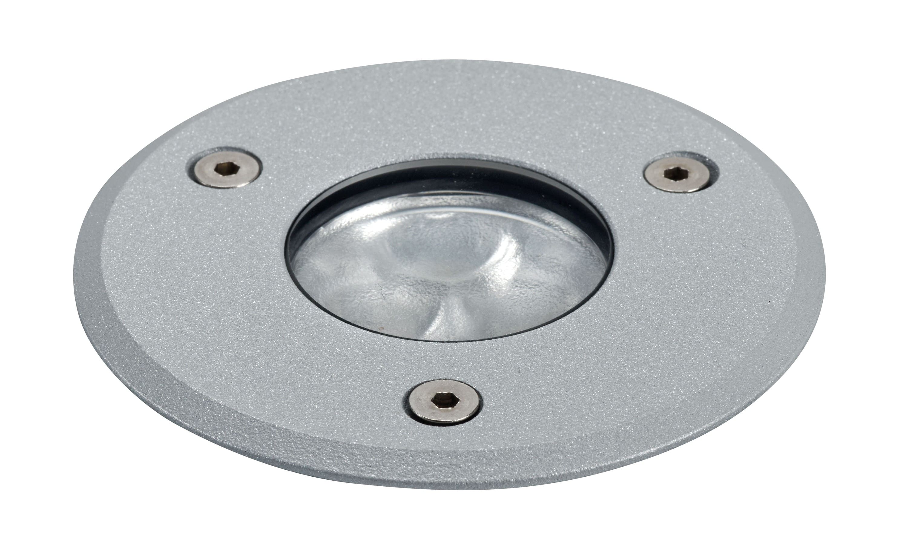 Encastré de sol Extérieur IP67 IK08, rond Ø80, collerette aluminium gris RAL9006, LED 24V DC 5,5W 3000K 40°, flux sortant 380lm, 60000H