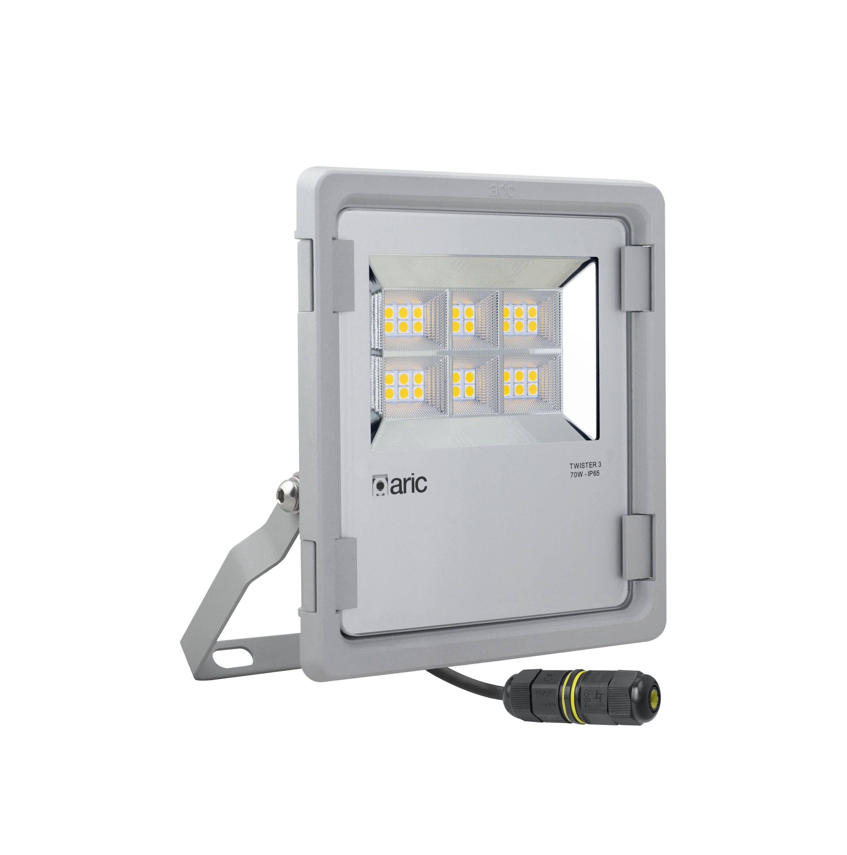Projecteur extérieur TWISTER 3 LED IP65 IK08, gris (RAL 9006), faisceau symétrique 90° LED intégré 70W 3000K 8400lm IRC80, intérieur/extérieur, durée de vie 50000h, test BS 480h, connecteur IP68 précâblé pour installation facile