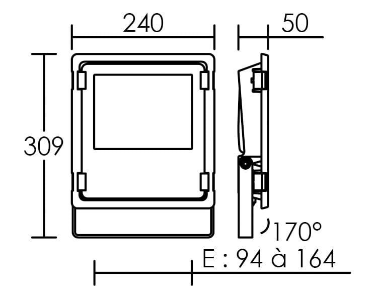Conçu pour respecter l’arrêté 2018 relatif à la réduction des nuisances lumineuses - IP65, pour une résistance accrue en extérieur - Vitre en verre trempé IK08 - Capacité de résistance de 480H au brouillard salin - Efficacité : 12000lm pour 100W, soit 120lm/W - Angle symétrique 90° - Durée de vie de 50'000 heures - Alimentation intégrée - Cable H05RN-F 3G 1mm2 en longueur 0.2m fourni et connecteur étanche IP68 pour raccordement rapide. - Dimensions et poids restreint pour une installation discrète
