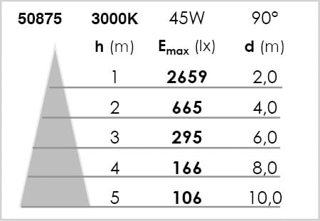 Détecteur Haute Fréquence, avec télécommande de réglage - Installation multi appareils maître / esclave - Conçu pour respecter l’arrêté 2018 relatif à la réduction des nuisances lumineuses - IP65, pour une résistance accrue en extérieur - Vitre en verre trempé IK08 - Capacité de résistance de 480H au brouillard salin - Efficacité : 4950lm pour 45W, soit 110lm/W - Angle symétrique 90° - Durée de vie de 50'000 heures - Alimentation intégrée - Cable H05RN-F 4G 1mm2 en longueur 0.85m fourni - Dimensions et poids restreint pour une installation discrète
