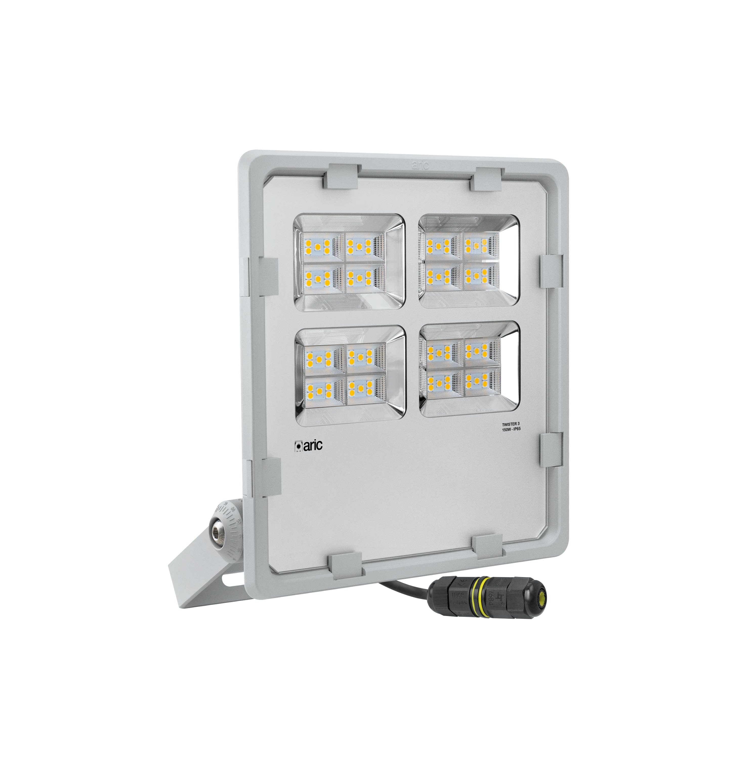 Projecteur extérieur TWISTER 3 LED IP65 IK08, gris (RAL 9006), faisceau symétrique 90° LED intégré 150W 3000K 19500lm IRC80, intérieur/extérieur, durée de vie 50000h, test BS 480h, connecteur IP68 précâblé pour installation facile