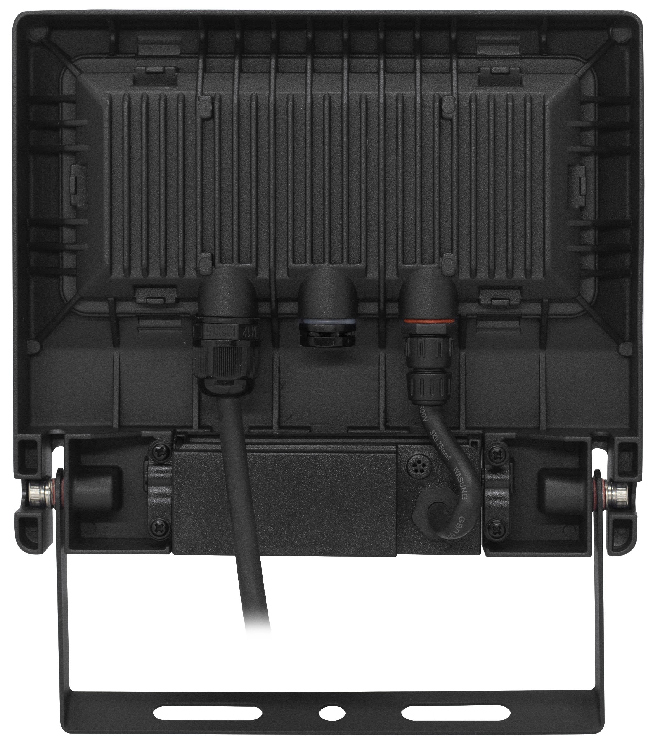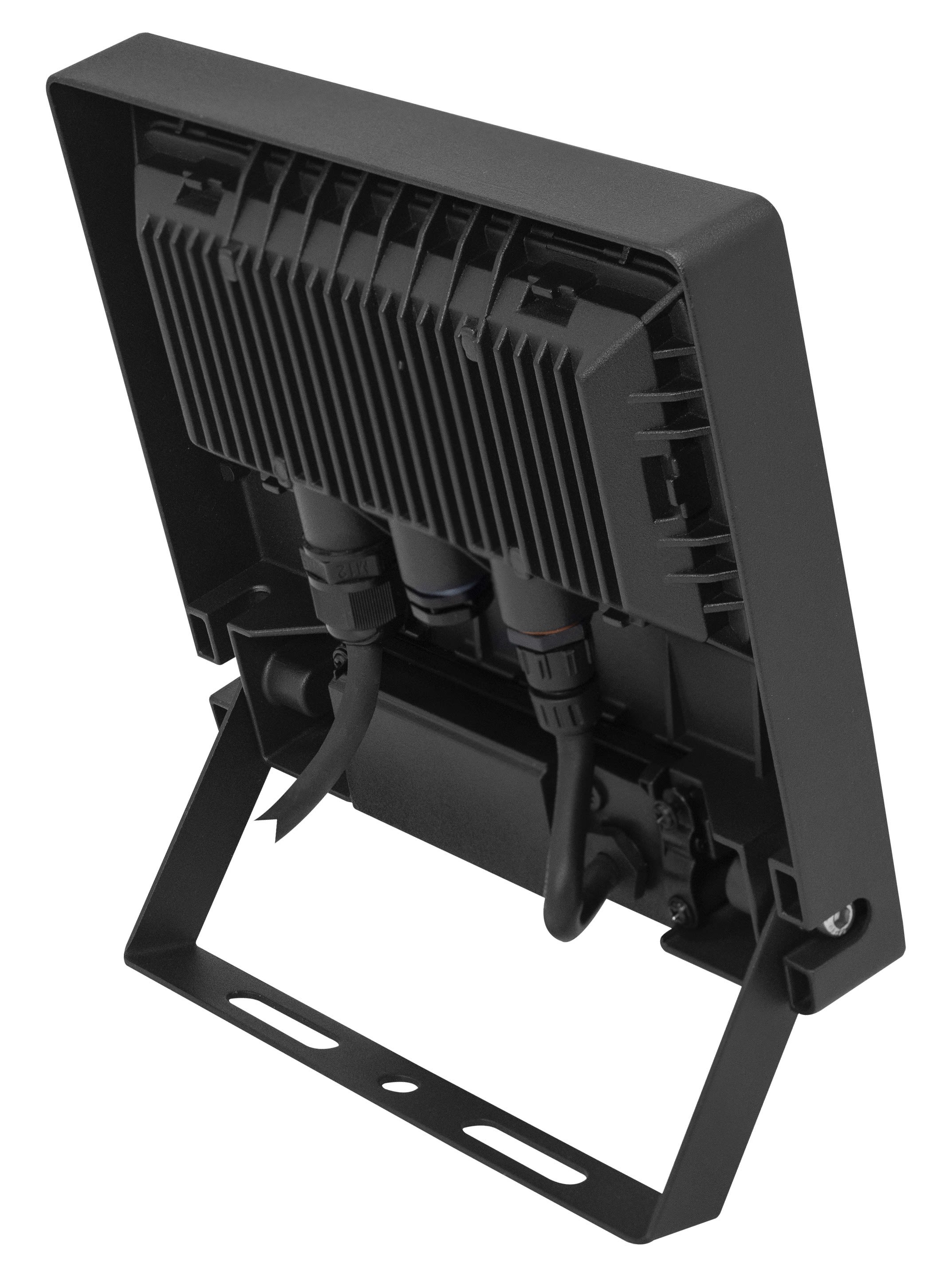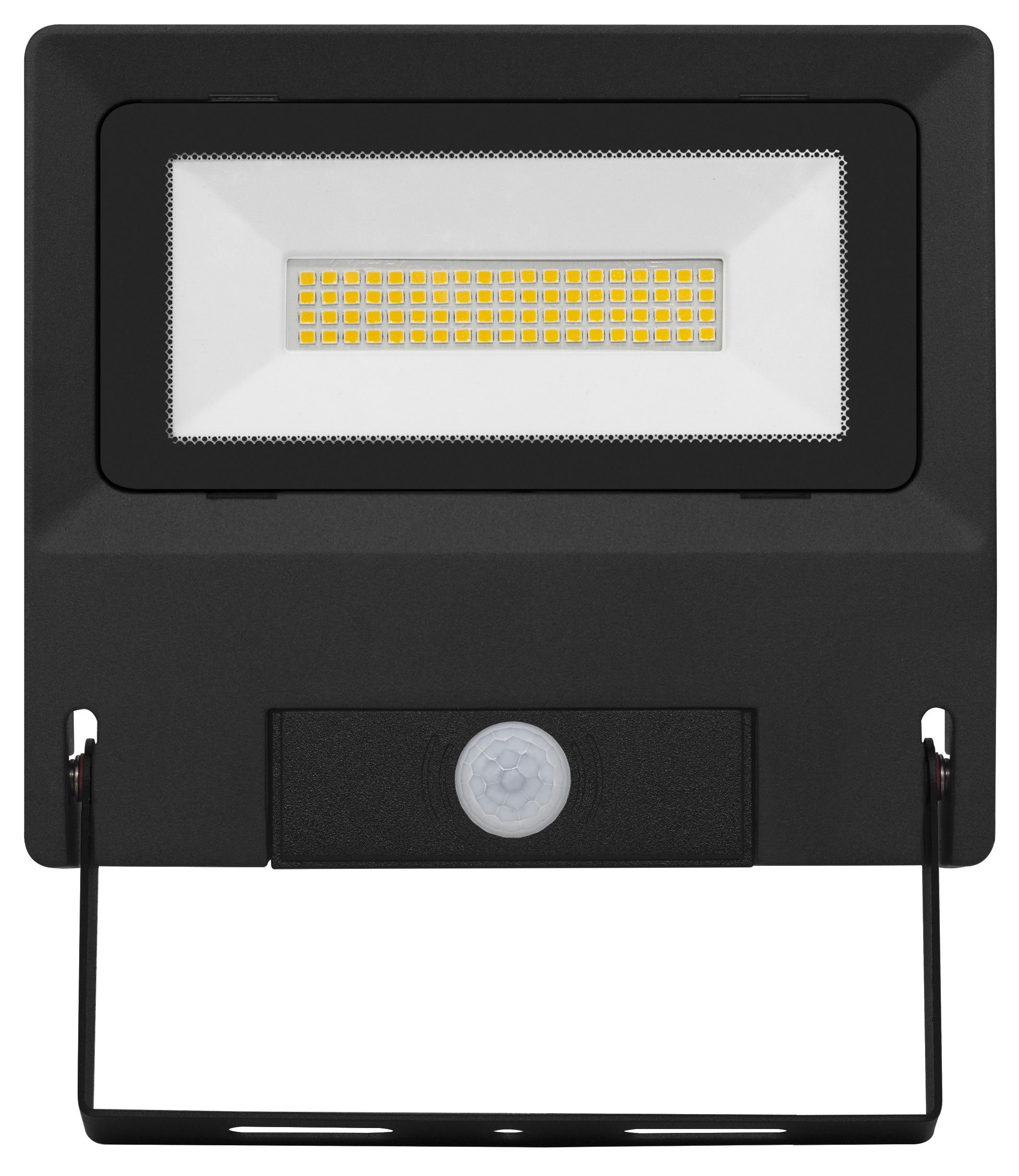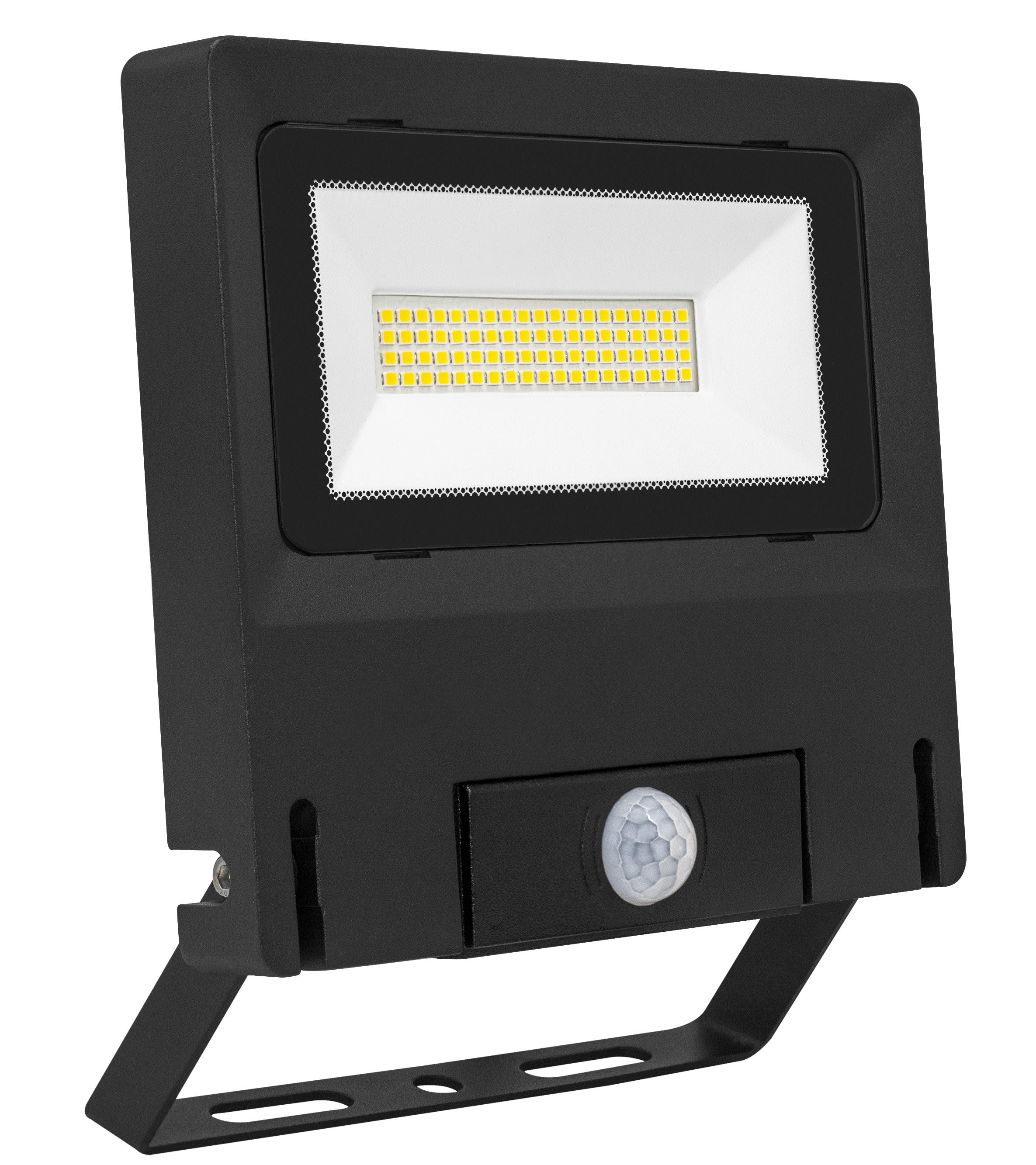 Projecteur extérieur LED IP65 IK08, noir, symétrique, faisceau 110° LED intégré 50W 4000K, flux sortant 5000 lumens (IRC >80), durée de vie 35000h, test BS = 480h, détecteur de mouvement PIR réglable intégré, télécommande fournie