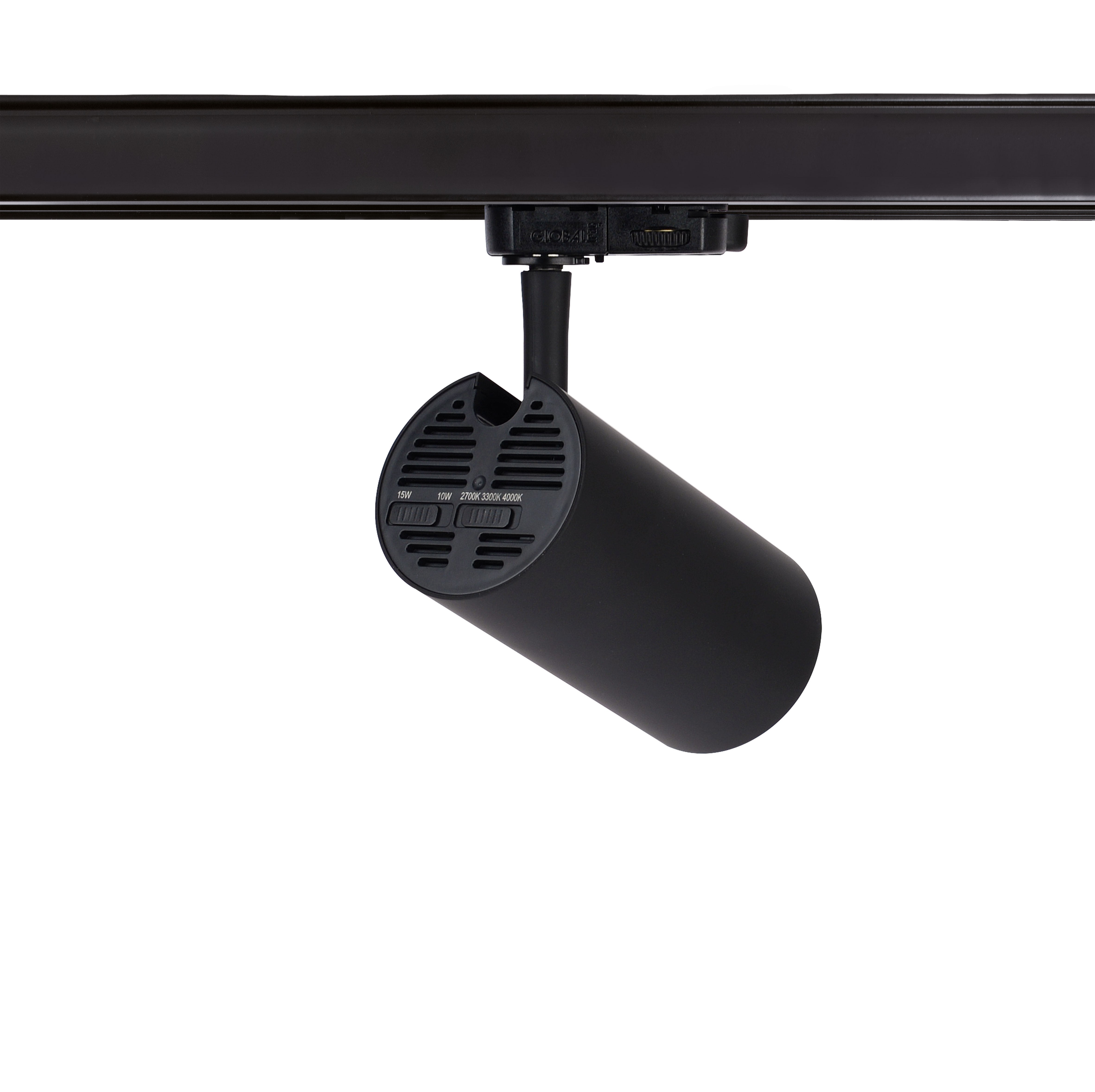 Pour l'éclairage commercial, nouveau luminaire sur rail Triphasé, POLARIS 023 45° 10/15W 3CCT NOIR, Deux puissances réglables à l’arrière du spot, Technologie CCT : 2700 K / 3300 K/4000 K Interrupteur à l’arrière du spot, Éclairage sans scintillement, Éclairage à 45°