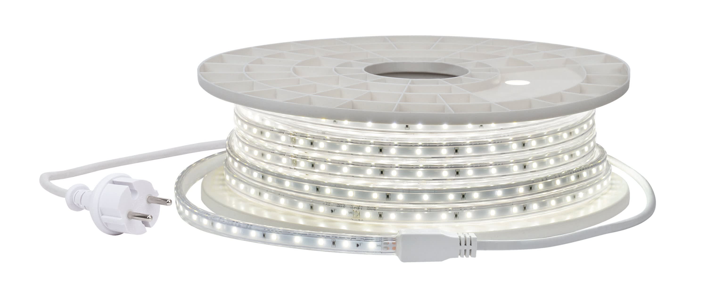 Ruban LED sous gaine PVC translucide (IP65) 230V direct, 8W/m, 60 LED/m 3000K 600lm/m, longueur : 50m. Découpe possible tous les 1 mètre (IP65 non garanti dans ce cas). Livré avec câble d'alimentation (IP65 + avec fiche 2P 16A - IP44) et 2 embouts de fermeture.