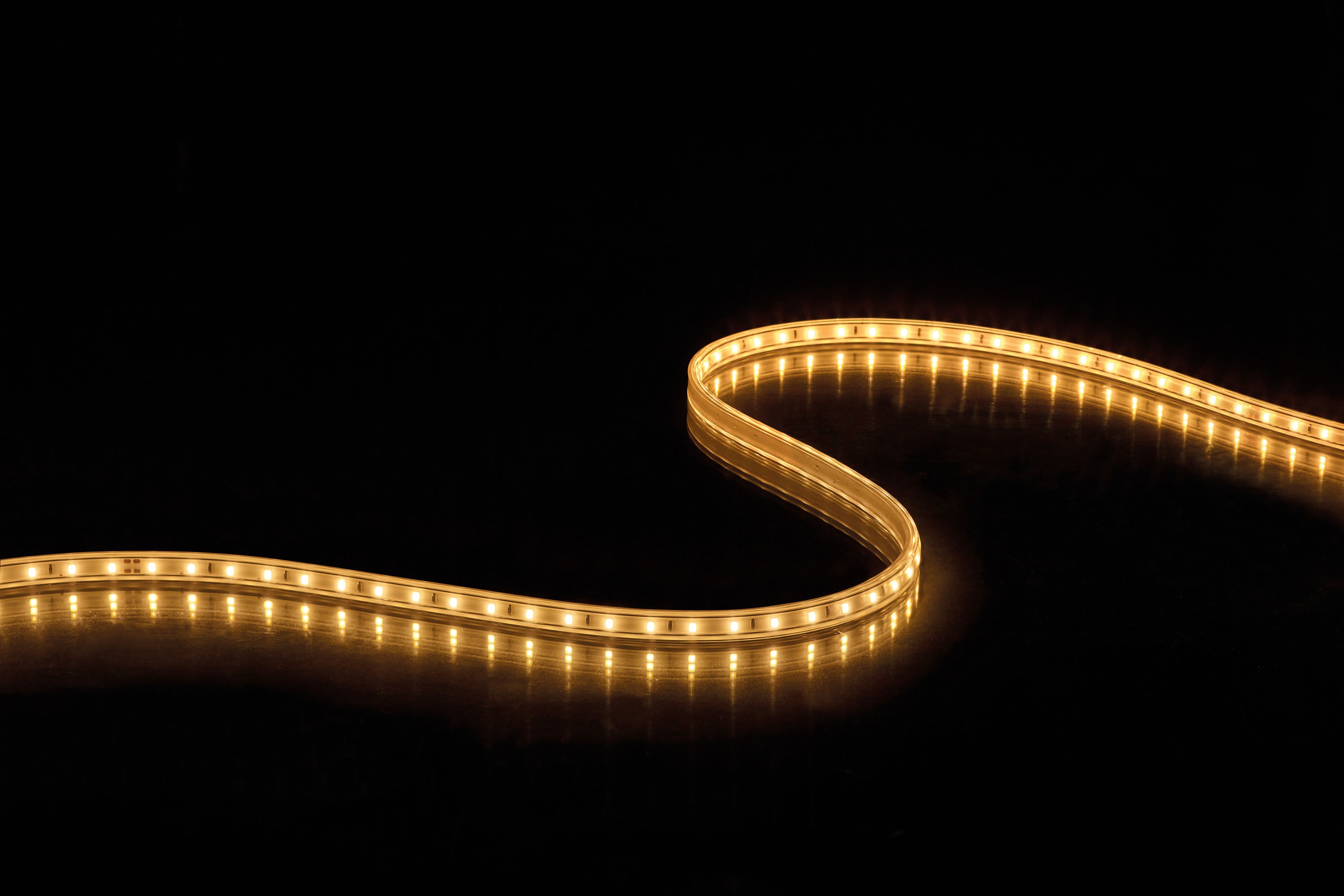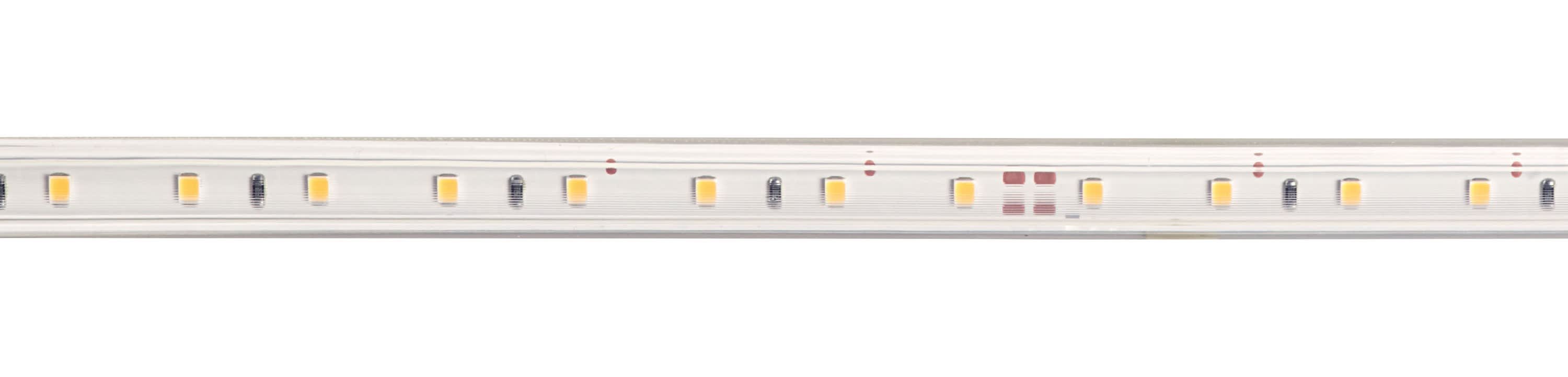 Ruban LED protégé sous gaine PVC pour utilisation extérieure ou industrielle, IP65 IK08 230V direct, 4000K 520 lm/m, 5.6W/m, longueur 40m, livré en rouleau, prêt à l'emploi avec câble d'alimentation H05RN-F 2x075mm² - lg 1,5m et prise IP44.