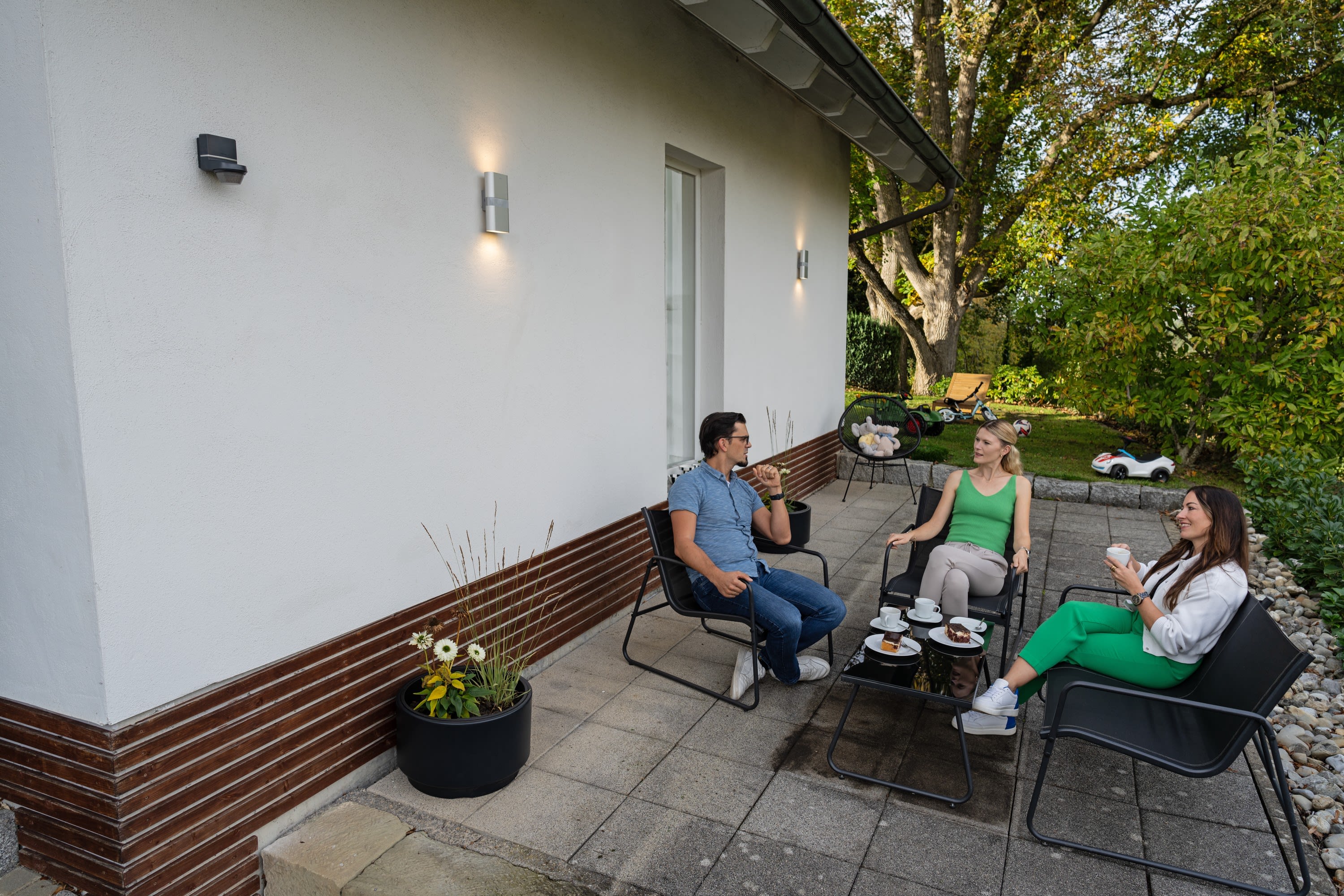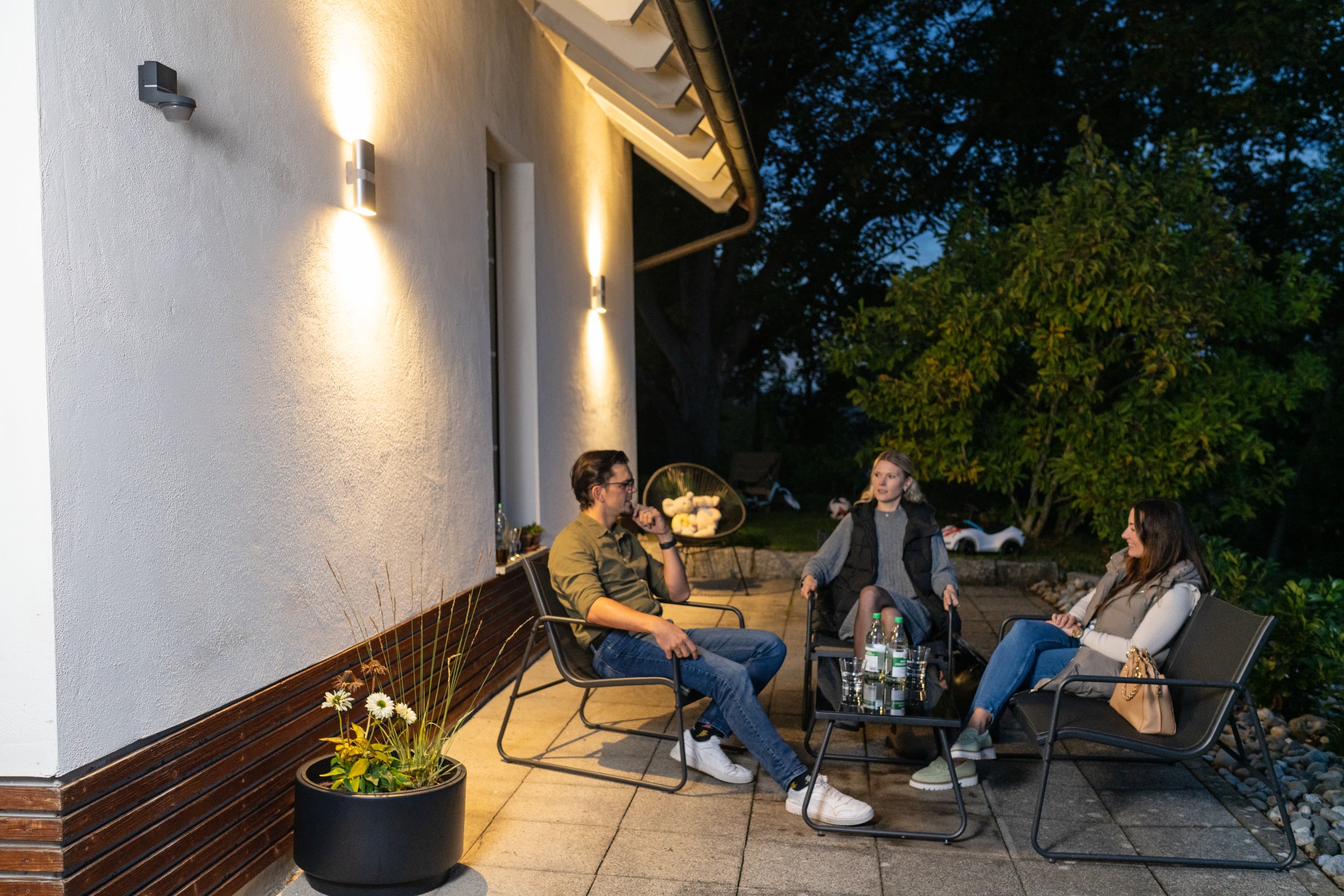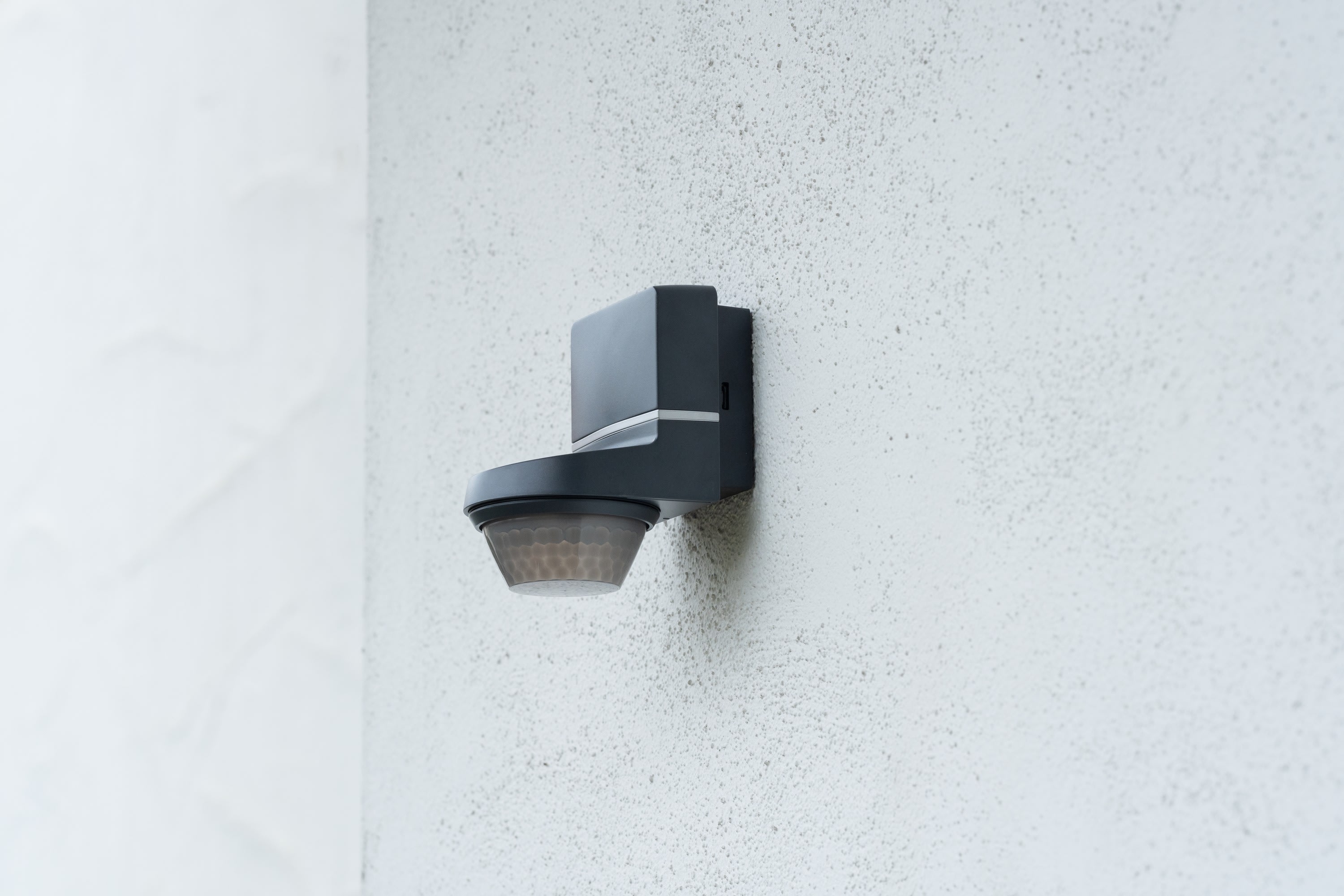 Détecteur PIR mural anthracite TECTA D280i AN, IP55, détection 280°, portée 12 m. Réglage via app bluetooth, sans ajustement mécanique. Modes Auto, permanent, D-MODE. Couplage possible, mesure lumière continue, Exit-on, test et impulsion.