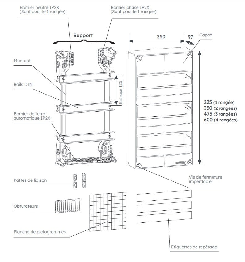 Tableau de répartition 2 rangées, 26 modules. IP 30. Equipé d'un châssis de montage, 1 capot de protection, 1 bornier de terre à connexion automatique, 2 obturateurs 6,5 modules, 1 planche de pictogrammes.