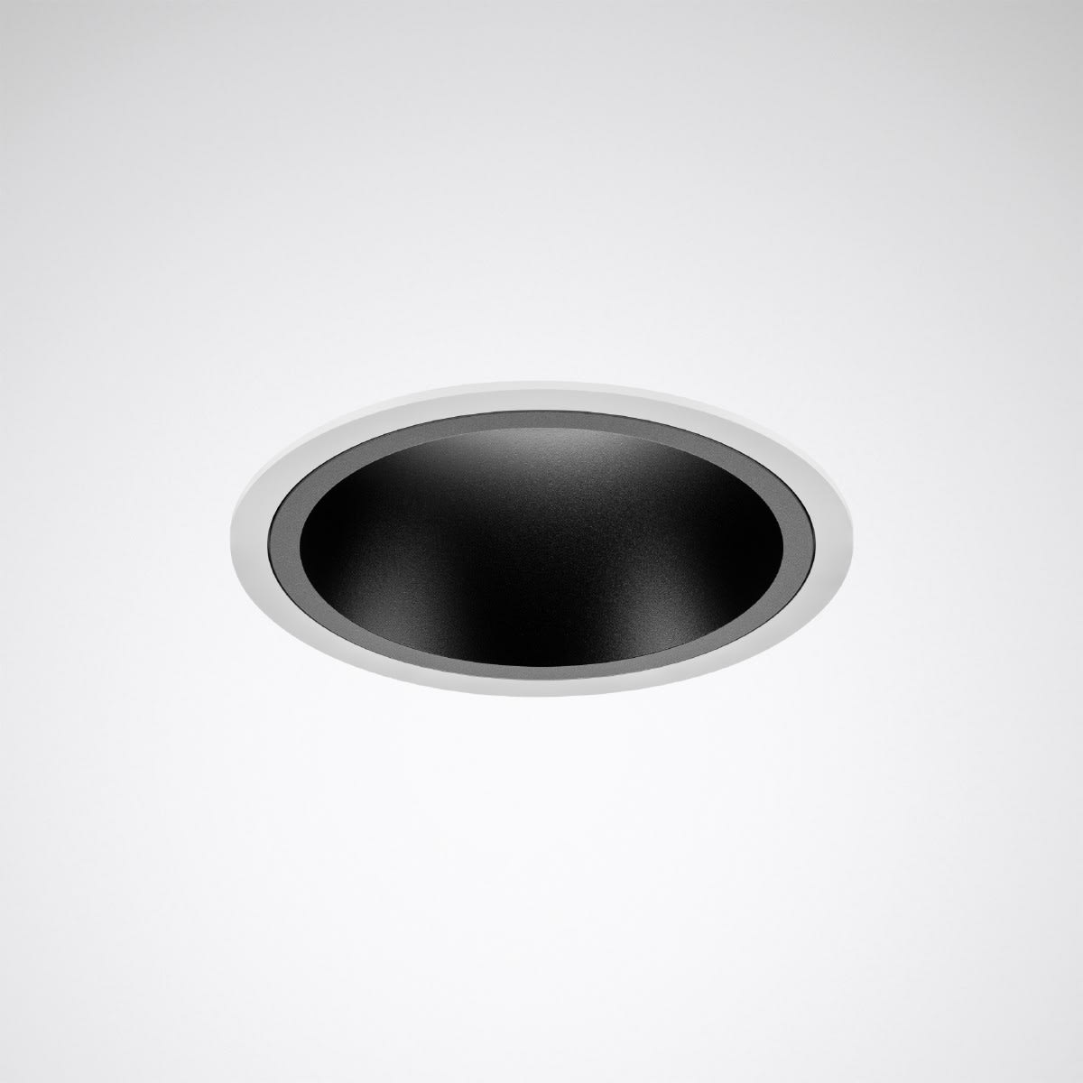 Downlight LED compact au format rond. Downlight encastré avec bord pour découpes de plafond. Convient pour une utilisation dans les entreprises certifiées HACCP, IFS et/ou BRC Global Standard Food. Découpe dans le plafond Ø 68 mm, Profondeur d’encastrement 80 mm. Des collerettes d’adaptation pour l’installation dans des découpes de plafond aux dimensions inadaptées sont disponibles en accessoires, à commander séparément. Avec réflecteur en plastique, revêtement noir. Le système optique avec une combinaison précisément adaptée de lentilles LED et d'éléments anti-éblouissants offre un très grand confort visuel accompagné d'une performance d'éclairage très élevée. Caractéristique de diffusion Spot. Compatible avec les écrans informatiques selon la norme EN 12464-1 grâce à des luminosités réduites L ≤ 3 000 cd/2 pour des angles d’éclairage supérieurs à 65 °, de manière omnidirectionnelle. Guidage de la lumière via une technologie de collimateurs/lentilles. Flux lumineux du luminaire et couleur de la lumière fixes. Flux lumineux du luminaire 500 lm, puissance raccordée 10 W, rendement lumineux maximale du luminaire 50 lm/W. Teinte de lumière blanc chaud, température de couleur (CCT) 2700 K, indice général de rendu des couleurs (IRC) Ra > 90. Tolérance de localisation chromatique (initialement MacAdam) ≤ 3 SDCM. Durée de vie assignée moyenne L80 (tq 25 °C) = 100.000 h., Durée de vie assignée moyenne L90 (tq 25 °C) = 50.000 h. La source lumineuse est remplaçable conformément aux exigences d'écoconception (Règlement (UE) 2019/2020). Boîtier, anneau de montage et dissipateur thermique en fonte d'aluminium. Surface à revêtement blanc (similaire à RAL 9016). Dimensions extérieures de la collerette Ø 75 mm. Classe électrique (EN 61140) : II, indice de protection (norme EN 60529) : IP20, Indice de protection par le dessous : IP54, degré de résistance aux chocs selon la norme CEI 62262 : IK06, température d’essai au fil incandescent selon la norme CEI 60695-2-11 : 850 °C. Température ambiante admissible (ta): -20 °C à 25 °C. Poids: 0.4 kg. Luminaire câblé sans halogène. Avec appareillage électronique, à gradation numérique (DALI). Appareillage conf. au standard DALI 2 (EN 62386). Possibilité de commutation et de gradation du luminaire au moyen de la fonction bouton-poussoir via les bornes de commande DALI (TouchDim). L'appareillage est remplaçable conformément aux exigences d'écoconception (Règlement (UE) 2019/2020). Ce luminaire qui est prêt au monitoring (MOR) fournit des données d’exploitation permettant une surveillance ou une maintenance prédictive, il est donc compatible avec les services de TRILUX Monitoring Services. Le produit répond aux exigences essentielles des directives européennes applicables et de la loi sur la sécurité des produits et porte le marquage CE. Le luminaire est en outre certifié ENEC par un organisme de contrôle indépendant.