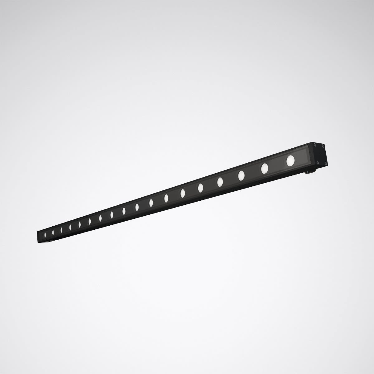 Plafonnier LED pour extérieur. En version MLT (Technologie Multi Lens), composé de systèmes de lentilles hautement efficaces, résistants aux UV et aux températures extrêmes, en montage quadruple. À répartition à symétrie en rotation semi-extensive des intensités lumineuses. Avec verre de fermeture, clair. Flux lumineux du luminaire et couleur de la lumière fixes. Flux lumineux du luminaire 3000 lm, puissance raccordée 27 W, rendement lumineux maximale du luminaire 111 lm/W. Teinte de lumière blanc chaud, température de couleur (CCT) 3000 K, indice général de rendu des couleurs (IRC) Ra > 80. Tolérance de localisation chromatique (initialement MacAdam) ≤ 3 SDCM. Durée de vie assignée moyenne L80 (tq 25 °C) = 50.000 h. Corps de luminaire en profilé d’aluminium extrudé et en éléments de fonte d’aluminium. Avec verre de fermeture en affleurement et unité LED intégrée. Surface à revêtement anthracite (similaire à DB 703). Dimensions (L x l): 900 mm x 32 mm, hauteur du luminaire 55 mm. Classe électrique (EN 61140) : III, indice de protection (norme EN 60529) : IP65, degré de résistance aux chocs selon la norme CEI 62262 : IK05. Température ambiante admissible (ta): -20 °C à 25 °C. Poids: 1.5 kg. Le raccordement électrique à l’appareillage séparé s’effectue grâce au câble d’alimentation sortant vers l’extérieur (2000 mm). Luminaire sans appareillage. Appareillage externe à commander séparément sous forme d’accessoires. L'appareillage est remplaçable conformément aux exigences d'écoconception (Règlement (UE) 2019/2020). Résistance aux pics de tension Mode différentiel / mode commun : / . Le produit répond aux exigences essentielles des directives européennes applicables et de la loi sur la sécurité des produits et porte le marquage CE.