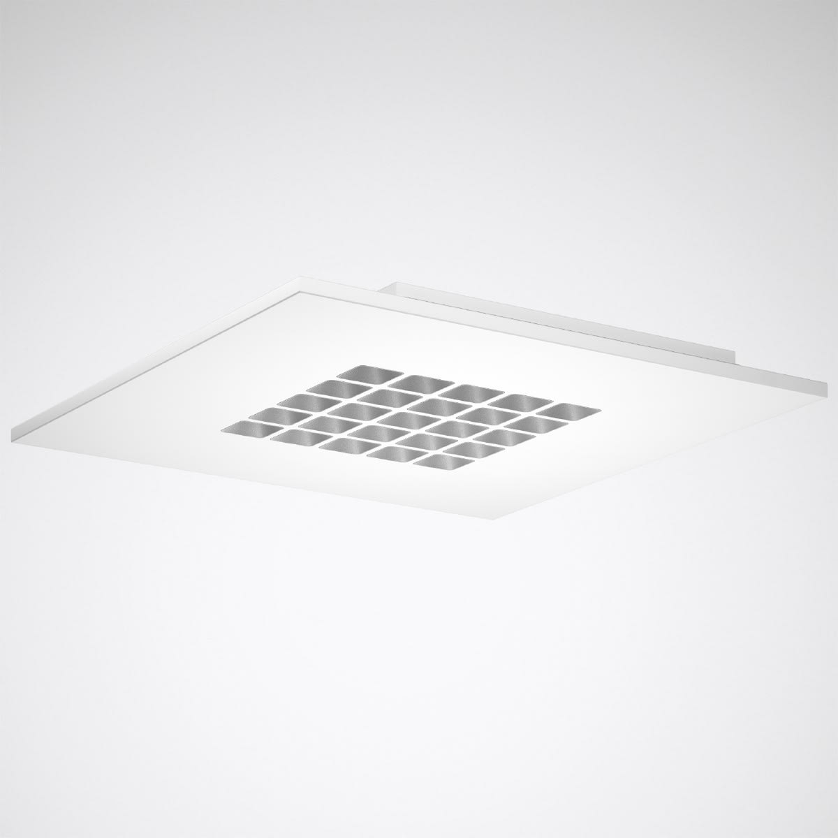 Plafonnier encastré LED, de forme carrée, à éléments lumineux en systèmes de lentilles et éléments anti-éblouissement cubiques très efficaces. Version M73 (600 mm x 600 mm). Le système optique avec une combinaison précisément adaptée de lentilles LED et d'éléments anti-éblouissants offre un très grand confort visuel accompagné d'une performance d'éclairage très élevée. À répartition symétrique limitée et extensive des intensités lumineuses. angle d’éclairage 79°. Taux d'éblouissement selon classification UGR (EN 12464-1) < 19. Compatible avec les écrans informatiques selon la norme EN 12464-1 grâce à des luminosités réduites L ≤ 3 000 cd/2 pour des angles d’éclairage supérieurs à 65 °, de manière omnidirectionnelle. Flux lumineux du luminaire et couleur de la lumière fixes. 25 éléments lumineux, en version carrée (5 x 5). Flux lumineux du luminaire 2900 lm, puissance raccordée 18 W, rendement lumineux maximale du luminaire 161 lm/W. Teinte de lumière blanc chaud, température de couleur (CCT) 3000 K, indice général de rendu des couleurs (IRC) Ra > 80. Tolérance de localisation chromatique (initialement MacAdam) ≤ 3 SDCM. Durée de vie assignée moyenne L80 (tq 25 °C) = 100.000 h., Durée de vie assignée moyenne L90 (tq 25 °C) = 50.000 h. La source lumineuse est remplaçable conformément aux exigences d'écoconception (Règlement (UE) 2019/2020). Corps de luminaire en tôle d’acier. Surface à revêtement blanc (similaire à RAL 9016). Cubes anti-éblouissement, en gris argent, à surface finement structurée (RAL 7001). Sur demande, les cubes anti-éblouissement peuvent être réalisés dans d’autres couleurs RAL. La couleur des cubes anti-éblouissement n’a aucun impact sur les caractéristiques photométriques du luminaire. Classe électrique (EN 61140) : II, indice de protection (norme EN 60529) : IP20, degré de résistance aux chocs selon la norme CEI 62262 : IK03, température d’essai au fil incandescent selon la norme CEI 60695-2-11 : 650 °C. Température ambiante admissible (ta): 25 °C . Poids: 4.5 kg. Raccordement rapide à protection contre l’inversion de polarité, à repiquage secteur jusqu’à Ø 2,5 mm2. Raccordement du ballast au luminaire au moyen d’un connecteur (Plug-and-Play). Le concept d’emballage du luminaire permet de retirer séparément l’appareillage pour son prémontage, les autres composants du luminaire restant protégés jusqu’à leur montage final. Avec driver externe dimmable (DALI). Appareillage conf. au standard DALI 2 (EN 62386). Possibilité de commutation et de gradation du luminaire au moyen de la fonction bouton-poussoir via les bornes de commande DALI (TouchDim). L'appareillage est remplaçable conformément aux exigences d'écoconception (Règlement (UE) 2019/2020). Appareillage protégé contre le mode à vide, les raccordements incorrects, les courts-circuits, surcharges et surtempératures. Ondulation de sortie de l’appareillage ≤ 4 % pour une commande efficace du système LED et une lumière sans scintillement. Ce luminaire qui est prêt au monitoring (MOR) fournit des données d’exploitation permettant une surveillance ou une maintenance prédictive, il est donc compatible avec les services de TRILUX Monitoring Services.