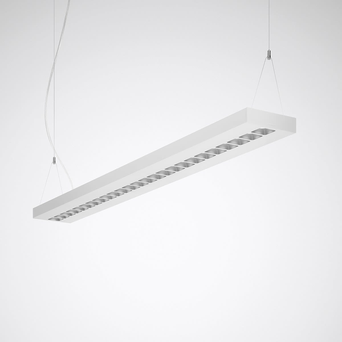 Luminaire suspendu LED à éléments lumineux composés de systèmes de lentilles et d’éléments anti-éblouissement cubiques très efficaces. Pour applications individuelles ou en ligne continue au moyen d’accessoires à commander séparément. Convenant à la réalisation de fileries traversantes. Le système optique avec une combinaison précisément adaptée de lentilles LED et d'éléments anti-éblouissants offre un très grand confort visuel accompagné d'une performance d'éclairage très élevée. À répartition symétrique limitée et extensive des intensités lumineuses. Taux d'éblouissement selon classification UGR (EN 12464-1) < 19. Compatible avec les écrans informatiques selon la norme EN 12464-1 grâce à des luminosités réduites L ≤ 1 500 cd/m2 pour angle d’éclairage supérieur à 65 °, de manière omnidirectionnelle. Flux lumineux du luminaire et couleur de la lumière fixes. Flux lumineux du luminaire 8900 lm, puissance raccordée 63 W, rendement lumineux maximale du luminaire 141 lm/W. Teinte de lumière blanc neutre, température de couleur (CCT) 4000 K, indice général de rendu des couleurs (IRC) Ra > 80. Tolérance de localisation chromatique (initialement MacAdam) ≤ 3 SDCM. Durée de vie assignée moyenne L80 (tq 25 °C) = 100.000 h., Durée de vie assignée moyenne L90 (tq 25 °C) = 50.000 h. La source lumineuse est remplaçable conformément aux exigences d'écoconception (Règlement (UE) 2019/2020). Corps de luminaire en tôle d’acier. Surface à revêtement blanc (similaire à RAL 9016). Cubes anti-éblouissement, en gris argent, à surface finement structurée (RAL 7001). Dimensions (L x l): 1509 mm x 170 mm, hauteur du luminaire 46 mm. Sur demande, les cubes anti-éblouissement peuvent être réalisés dans d’autres couleurs RAL. Classe électrique (EN 61140) : I, indice de protection (norme EN 60529) : IP20, degré de résistance aux chocs selon la norme CEI 62262 : IK03, température d’essai au fil incandescent selon la norme CEI 60695-2-11 : 650 °C. Température ambiante admissible (ta): 25 °C . Poids: 7.0 kg. Avec driver, dimmable (DALI). Appareillage conf. au standard DALI 2 (EN 62386). Possibilité de commutation et de gradation du luminaire au moyen de la fonction bouton-poussoir via les bornes de commande DALI (TouchDim). L'appareillage est remplaçable conformément aux exigences d'écoconception (Règlement (UE) 2019/2020). Ce luminaire qui est prêt au monitoring (MOR) fournit des données d’exploitation permettant une surveillance ou une maintenance prédictive, il est donc compatible avec les services de TRILUX Monitoring Services. Le produit répond aux exigences essentielles des directives européennes applicables et de la loi sur la sécurité des produits et porte le marquage CE.