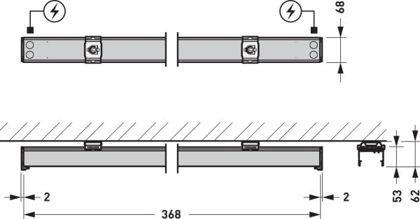 Profil-support sans accouplement mécanique pour ligne continue et connecteur électrotechnique rapide pour les applications de luminaires individuels 78... E-Line 7850 Pro. Avec filerie d’alimentation continu à 7 conducteurs pour un raccordement rapide et sans outil des platines-appareillages librement positionnables, Section de conducteur 7 x 2,5 mm2, sans halogène. La gestion de la dilatation thermique du système de conduction du courant se fait par des fixations ponctuelles du conducteur et du segment porteur. Convient pour une utilisation dans des environnements nécessitant un indice de protection allant jusqu'à IP64 (IP20/IP50/IP64). L'indice de protection de la ligne continue est déterminé par les platines-appareillages et les accessoires. Si l'indice IP5x est atteint en combinaison avec la platine-appareillage et les accessoires, le luminaire convient à une utilisation dans des sites de production à risque d'incendie selon la norme DIN EN 60598-2-24 (identifiant D).. Le corps du profil-support est en tôle d'acier profilée et galvanisée à chaud.. Revêtu d'un vernis de protection à l'intérieur, d'un vernis polyester à l'extérieur, couleur blanc (similaire à RAL 9016). Longueur du profil-support: 369 mm. Pour une application en ligne continue, l’entraxe de fixation peut atteindre 4 000 mm.