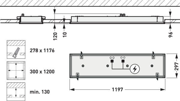 Luminaire encastré LED rectangulaire pour blocs opératoires et zones de fabrication aux exigences rigoureuses en termes d’hygiène et de pureté de l’air. Version M46 (300 mm x 1 200 mm). Convient pour une utilisation dans les entreprises certifiées HACCP, IFS et/ou BRC Global Standard Food. Aptitude certifiée à l’utilisation en salle blanche des classes de propreté DIN EN ISO 14644-1 – Classe 1 selon TÜV Süd. Conforme aux classes A à D du guide des BPF de l’UE. Avec température de surface limitée (DIN EN 60598-2-24, identifiant D). Découpe dans le plafond 1176 mm x 278 mm, Profondeur d’encastrement > 100 mm. La fixation simple du luminaire, non monté en affleurement, s’effectue au moyen de quatre étriers pivotants, intégrés au corps du luminaire. Cache extérieur du luminaire composé d'un verre de sécurité feuilleté transparent très résistant avec un liant pour les éclats et d'un cache translucide en PMMA à l'intérieur. Pour éviter des réflexions incontrôlées lors de l’utilisation de la technique laser, la surface à l’intérieur du luminaire est finement structurée. Résistant aux désinfectants doux et aux rayonnements ultraviolets. Avec une répartition lambertienne des intensités lumineuses. Effet de lumière homogène. Flux lumineux du luminaire et couleur de la lumière fixes. Flux lumineux du luminaire 8500 lm, puissance raccordée 59 W, rendement lumineux maximale du luminaire 144 lm/W. Teinte de lumière blanc neutre, température de couleur (CCT) 4000 K, indice général de rendu des couleurs (IRC) Ra > 90. Tolérance de localisation chromatique (initialement MacAdam) ≤ 3 SDCM. Durée de vie assignée moyenne L80 (tq 40 °C) = 100.000 h., Durée de vie assignée moyenne L90 (tq 25 °C) = 100.000 h. La source lumineuse est remplaçable conformément aux exigences d'écoconception (Règlement (UE) 2019/2020). Corps de luminaire en tôle d’acier, laquage par poudre, blanc L’étanchéité de l’espace au plafond est réalisée par un joint périphérique en mousse polyuréthane. Des fermetures à contact glissant, situées à l’intérieur intègrent automatiquement le cadre à la protection électrique. Dimensions (L x l): 1197 mm x 297 mm, hauteur du luminaire 94 mm. Classe électrique (EN 61140) : I, indice de protection (norme EN 60529) : IP54, Indice de protection par le dessous : IP65, degré de résistance aux chocs selon la norme CEI 62262 : IK08, température d’essai au fil incandescent selon la norme CEI 60695-2-11 : 960 °C. Température ambiante admissible (ta): 40 °C Poids: 11.2 kg. Avec appareillage électronique, à gradation numérique (DALI). Appareillage conf. au standard DALI 2 (EN 62386). Possibilité de commutation et de gradation du luminaire au moyen de la fonction bouton-poussoir via les bornes de commande DALI (TouchDim). L'appareillage est remplaçable conformément aux exigences d'écoconception (Règlement (UE) 2019/2020). Ce luminaire qui est prêt au monitoring (MOR) fournit des données d’exploitation permettant une surveillance ou une maintenance prédictive, il est donc compatible avec les services de TRILUX Monitoring Services. Le luminaire est en outre certifié ENEC par un organisme de contrôle indépendant.