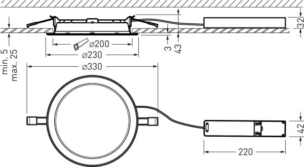 Downlight LED pour les plafonds avec une dimension de cavité ≥ 50 mm. Découpe dans le plafond Ø 200 mm, Profondeur d’encastrement 43 mm. Avec plaque de recouvrement en PMMA opale. Avec une répartition lambertienne des intensités lumineuses. angle d’éclairage 113°. Flux lumineux du luminaire et couleur de la lumière fixes. Flux lumineux du luminaire 2000 lm, puissance raccordée 16.5 W, rendement lumineux maximale du luminaire 121 lm/W. Teinte de lumière blanc neutre, température de couleur (CCT) 4000 K, indice général de rendu des couleurs (IRC) Ra > 80. Tolérance de localisation chromatique (initialement MacAdam) ≤ 4 SDCM. La source lumineuse est remplaçable conformément aux exigences d'écoconception (Règlement (UE) 2019/2020). Corps du luminaire en PC. Collerette, laquage par poudre, blanc (similaire à RAL 9016). Dimensions extérieures de la collerette Ø 230 mm, hauteur du luminaire 43 mm. Classe électrique (EN 61140) : I, indice de protection (norme EN 60529) : IP20, degré de résistance aux chocs selon la norme CEI 62262 : IK03, température d’essai au fil incandescent selon la norme CEI 60695-2-11 : 650 °C. Température ambiante admissible (ta): 25 °C Poids: 0.5 kg. Avec appareillage électronique, commutable. L'appareillage est remplaçable conformément aux exigences d'écoconception (Règlement (UE) 2019/2020). Le produit répond aux exigences essentielles des directives européennes applicables et de la loi sur la sécurité des produits et porte le marquage CE. Le luminaire est en outre certifié ENEC par un organisme de contrôle indépendant.