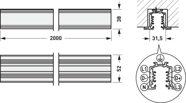 Rail conducteur triphasé encastré avec équipement DALI (6 conducteurs). Système Rail (Stucchi). En aluminium, revêtement poudre. Avec une structure de surface fine. Couleur blanc (similaire à RAL 9016). Dimensions (L x l x H) : 2000 mm x 52 mm x 38 mm.