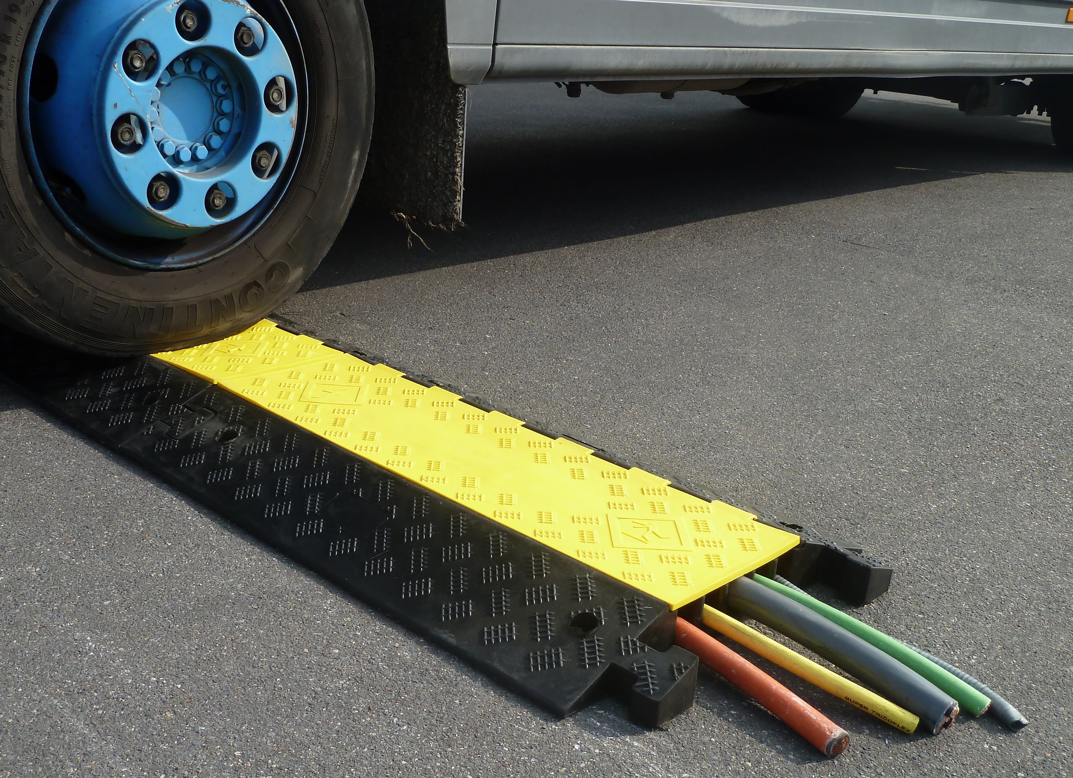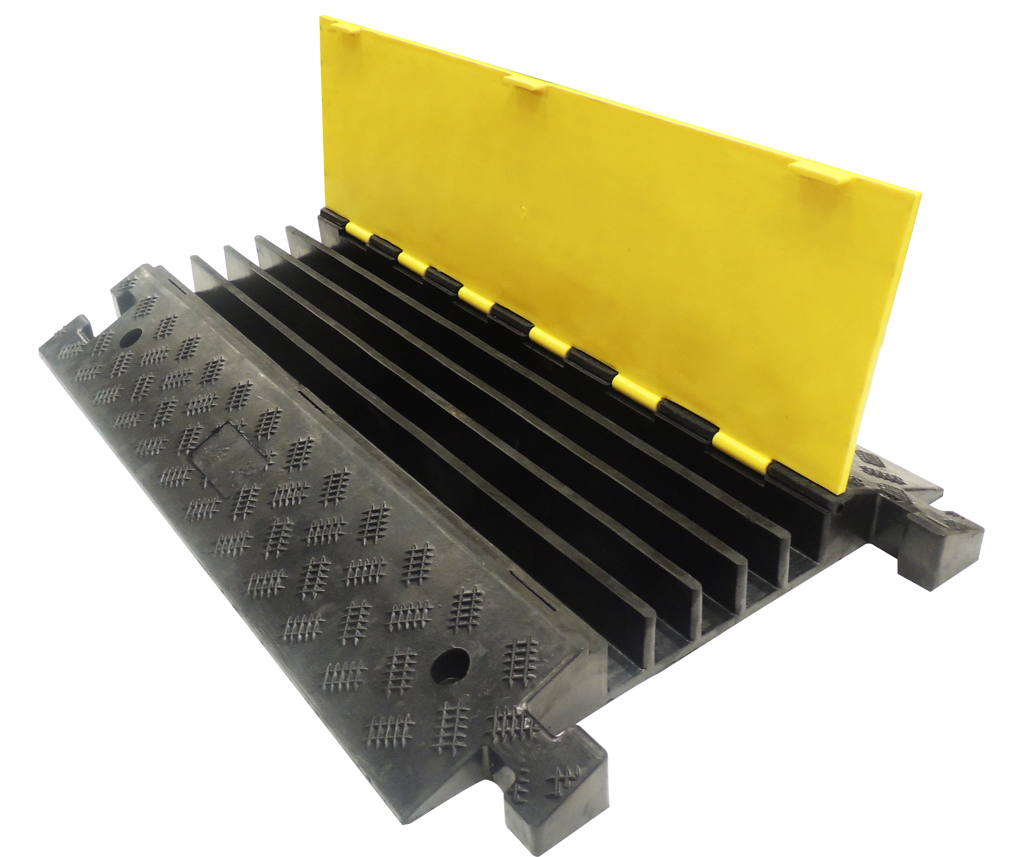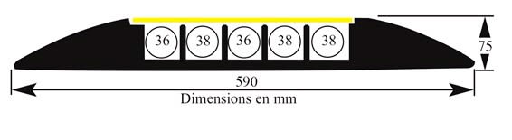 COBRA 38-5 : passage de cable Vehicules - 89cm - 3 canaux Ø38mm + 2 canaux Ø36mm - Pour poids lourds 44 tonnes (certifié LNE) - Rouler au pas - Base noireélastomère et capot jaune sur charnière -Largeur 580mm, hauteur 75mm -Poids 22kg