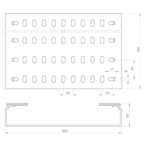 Chemin de câbles fond perforé gris RAL7035 60x300 U23X. Pour installations intérieures et extérieures exposées aux intempéries.