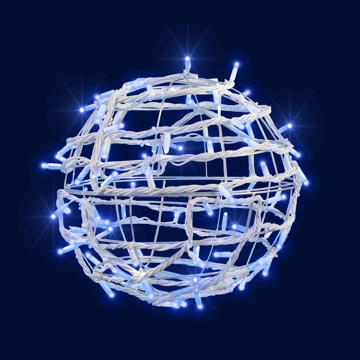 SATURN Sphère 3D LED pétillante, ø1m 300 LED Bleu pétillant blanc, structure fil argent câble blanc 230V raccordable. Livrée avec T. Ultralumineuse : LED de haute qualité, Ø 8mm, construction à diffusion multidirectionnelle qui assure une parfaite répartition de la lumière. Pétillement flashant élégant et raffiné