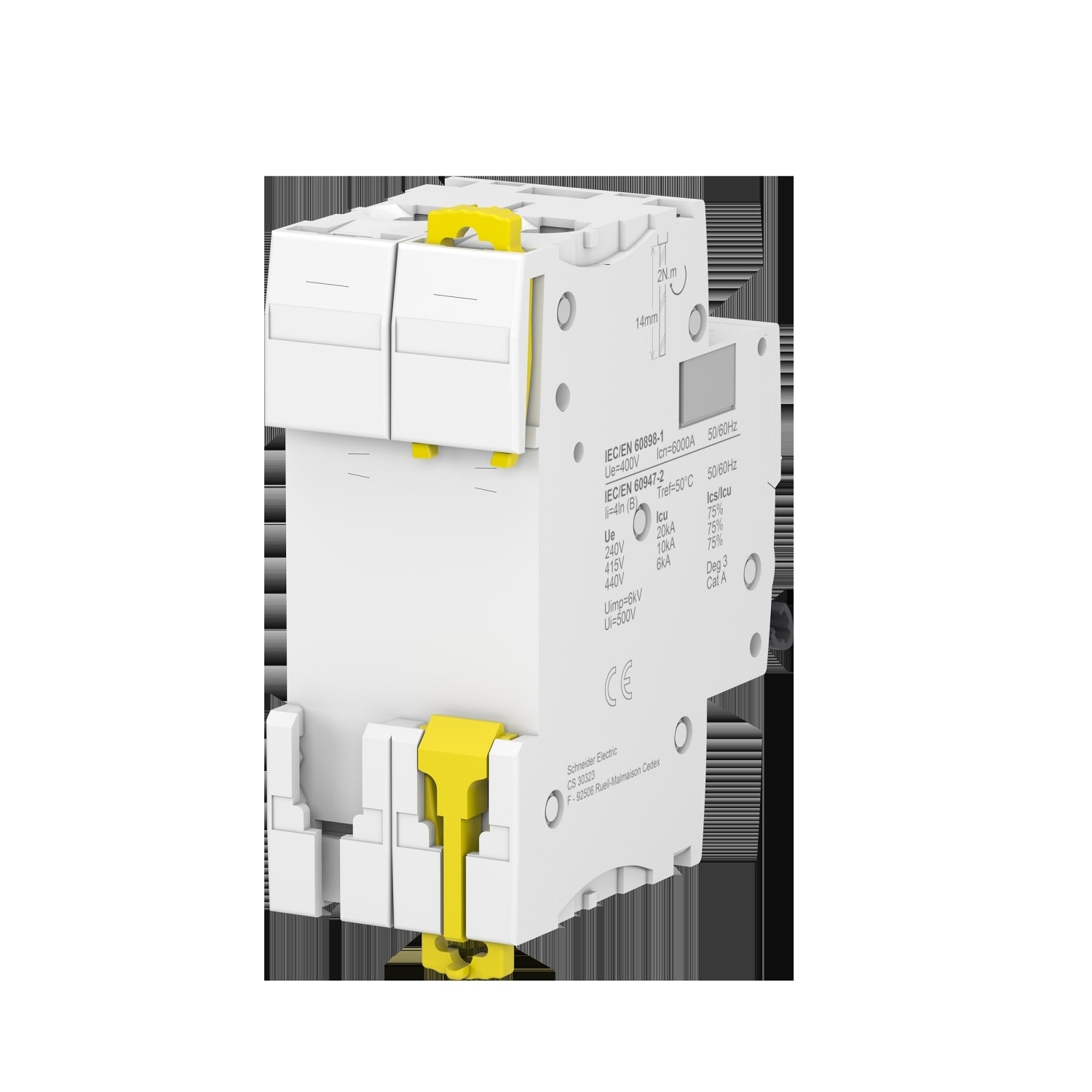 Ce disjoncteur Acti9 iC60N est dédié aux applications tertiaires. En version 2P 6A en Courbe B, son pouvoir de coupure assigné est de 6000A (EN 60898-1) et de 10kA (EN 60947-2) sur des réseaux 230Vca.