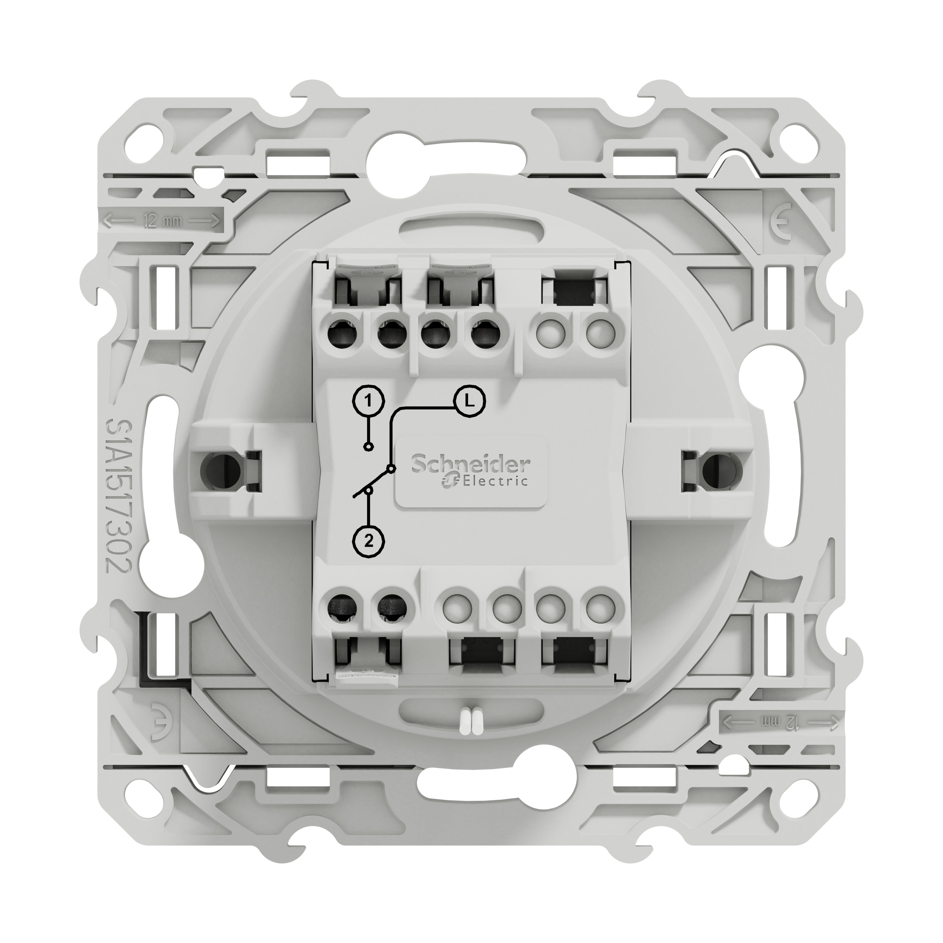 L’interrupteur Odace S530263 de Schneider Electric est un mécanisme équipé d’un cadre de fixation en plastique de couleur aluminium. La tenue diélectrique est de 2000 V. Il est conforme à la norme 2006/95/CEE, EN 60669-1. Il s'agit d'un interrupteur à 2 voies à 1 pôle avec 1 culbuteur. Son boîtier de montage adapté peut être encastré dans la surface du mur. Il a également obtenu le certificat NF. Son courant nominal est de 10 AX. L'interrupteur est en PBT (polybutylène téréphtalate) GF30, PC (polycarbonate) GF10 FR, thermoplastique ABS stabilisé aux UV, le rendant aussi résistant que possible. Afin de prendre soin de l'environnement et de votre santé, il ne contient ni mercure ni métaux lourds. La fixation de cet appareil se fait par vis. De plus, étant respectueux de l'environnement, ce dispositif a atteint une résistance aux UV, l'acétone, l'alcool, l'ammoniaque, l'eau de Javel, le savon liquide, l'huile, l'essence, le liquide de nettoyage des fenêtres. L'indice de protecetion est IP21D