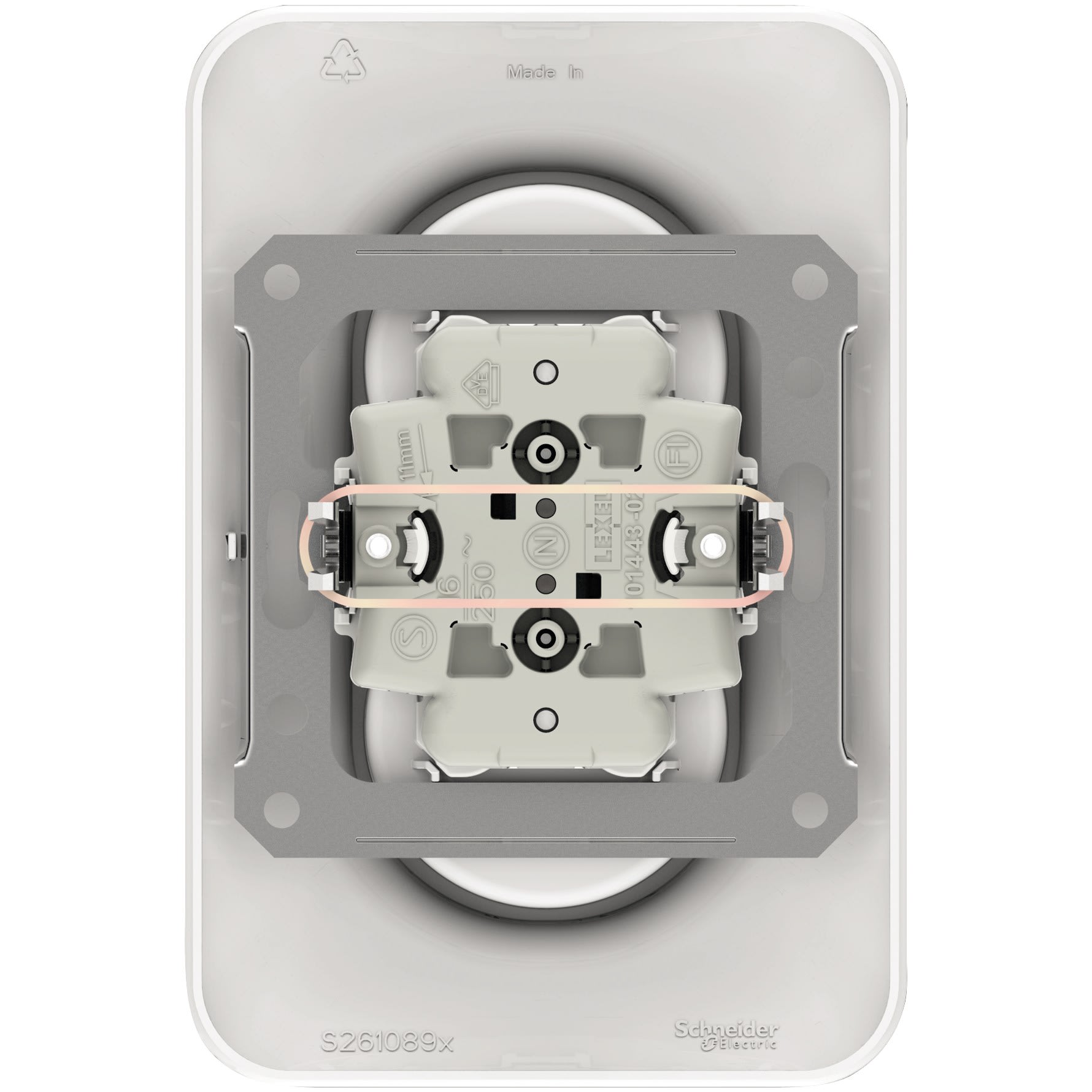 S261089 se compose d'un mécanisme double prise avec les griffes montées et son enjoliveur de prise blanc mat RAL9010. Son support de fixation intégré permet l'installation sur une boîte avec ou sans vis.