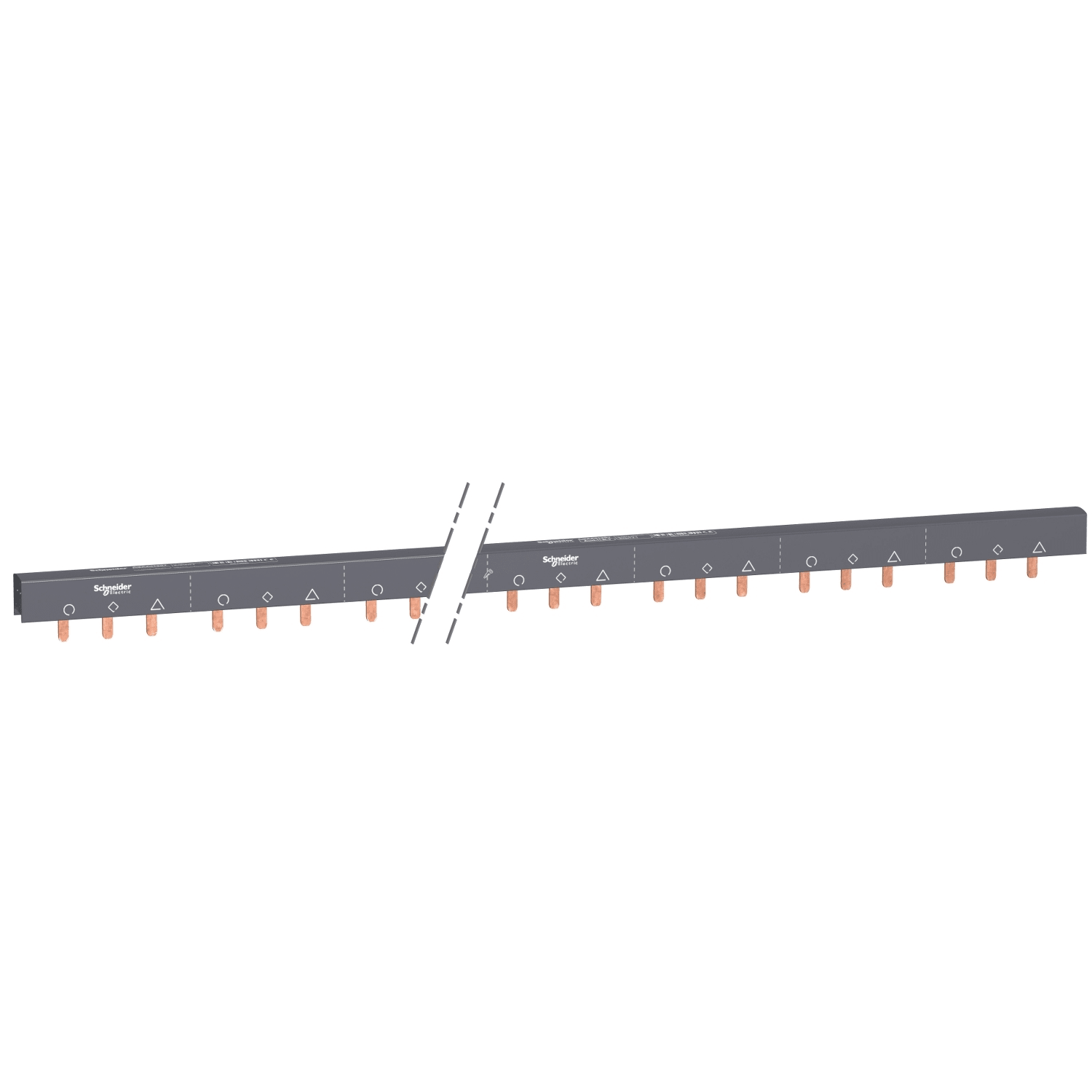 Ce produit Acti9 est un peigne horizontal découpable 57 modules avec auxiliaire 9mm pour Acti9 iC60 ou Acti9 iK60. Il est dédié aux installations Aux+3L. Le type est AuxL1L2L3 (auxiliaire, ligne). Il s'agit d'un ensemble de 1 appareil. Il convient à 16 appareils (3P) avec des auxiliaires associés. La longueur est de 1000 mm. 16 modules de 18 mm. La section des broches est de 16 mm². Le type de connexion électrique est PIN. Le nombre de phases est de 3. Le nombre de pôles est de 3. Le courant assigné d'emploi Ie à 40 °C est de 100 A. Le courant de court-circuit Icc est compatible avec le pouvoir de coupure des disjoncteurs Schneider Electric. La tension d’isolement nominale Ui est de 500 VCA. La tension assignée d'emploi est de 415 Vca. L'appareil est de couleur blanche RAL9003. Le degré de pollution est de 3. Selon la norme CEI 60695-2-1, la résistance au feu est auto-extinguible à 960 °C dans les 30 s. Il est conforme aux normes IEC 60947-7-1 et IEC 61439-2.