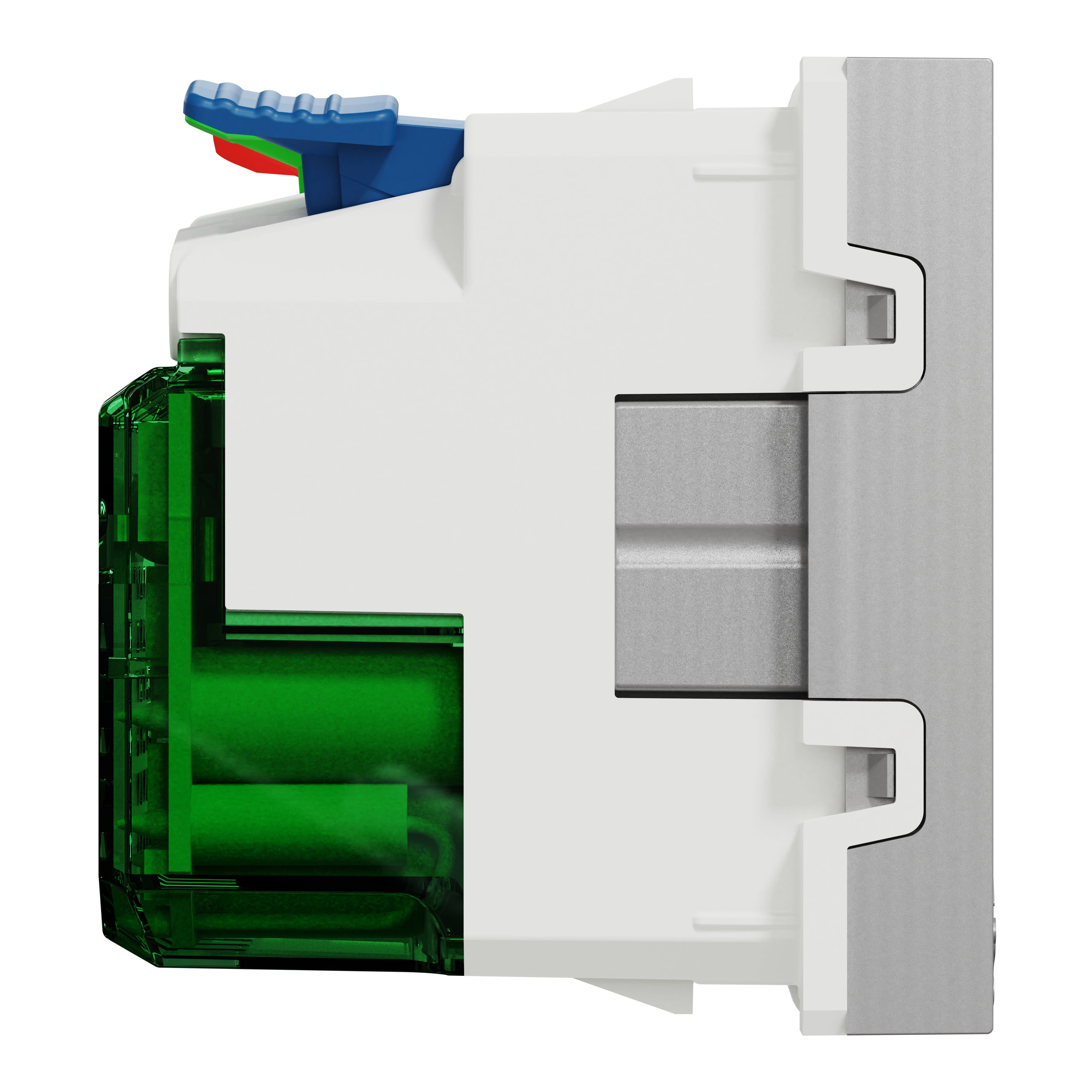 NU301530, en version 2 modules, se compose d'un mécanisme de prise affleurante avec USB C et d'un enjoliveur simple aluminium. Dans le cas d'une installation murale, il sera à associer avec un support de fixation (commençant par NU700) et une plaque de finition Unica (Pro, Studio, Pure). Dans les autres cas il se clipsera directement sur le support compatible : goulottes, boitiers de sol, poste de travail, colonnes, colonnettes, …