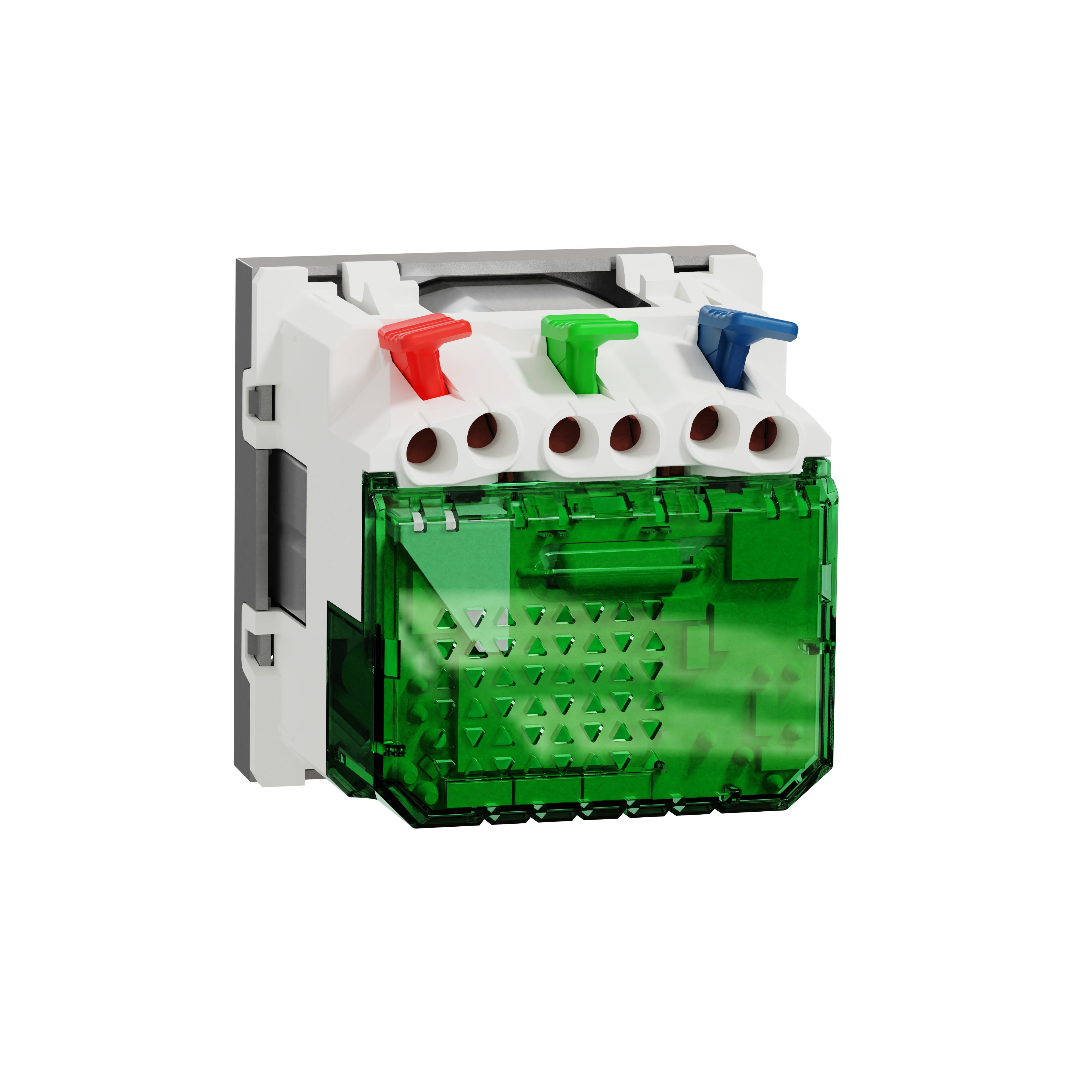 Le câblage de cette prise combinée est identique à un câblage de prise seule (3 fils : phase, neutre, terre) pour plus de facilité à l'installation. La couleur des poussoirs de déconnexion permet une identification rapide du câblage. Les bornes automatiques permettent une connexion rapide et sans outil. La prise combinée peut s'installer en lieu et place d'une prise standard pour doubler les fonctions sur 1 poste en apportant ergonomie et esthétisme. Sa dimension compacte et réduite facilite son installation dans tous les supports pouvant accueillir du 45x45 (poste de travail, goulotte, ...). Sa consommation en veille est très faible : 0,075 W.
